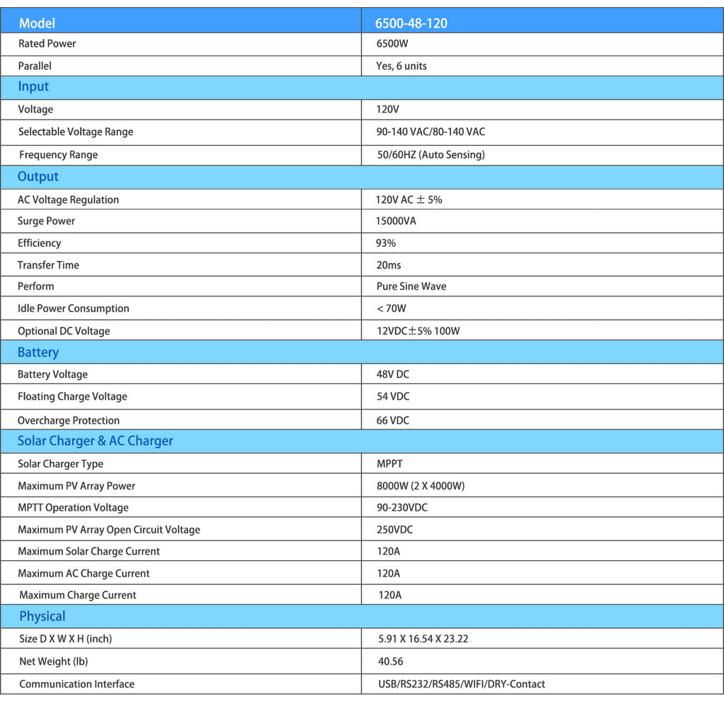 ★ Solar Inverter: 6.5KW DC 48V pure sine wave AC output 120V, Built-in MPPT solar charger max 120A and utility battery charger max 120A, Max PV input 390V (VOC), Dual PV input. UL 1741 Standard Listed by TUV / CSA / FCC