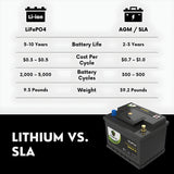 A: This lithium battery offers superior performance, longer lifespan, faster charging, and a lighter weight compared to traditional lead-acid batteries. It also delivers higher cold-cranking amps (CCA) for better starting power, especially in cold weather.