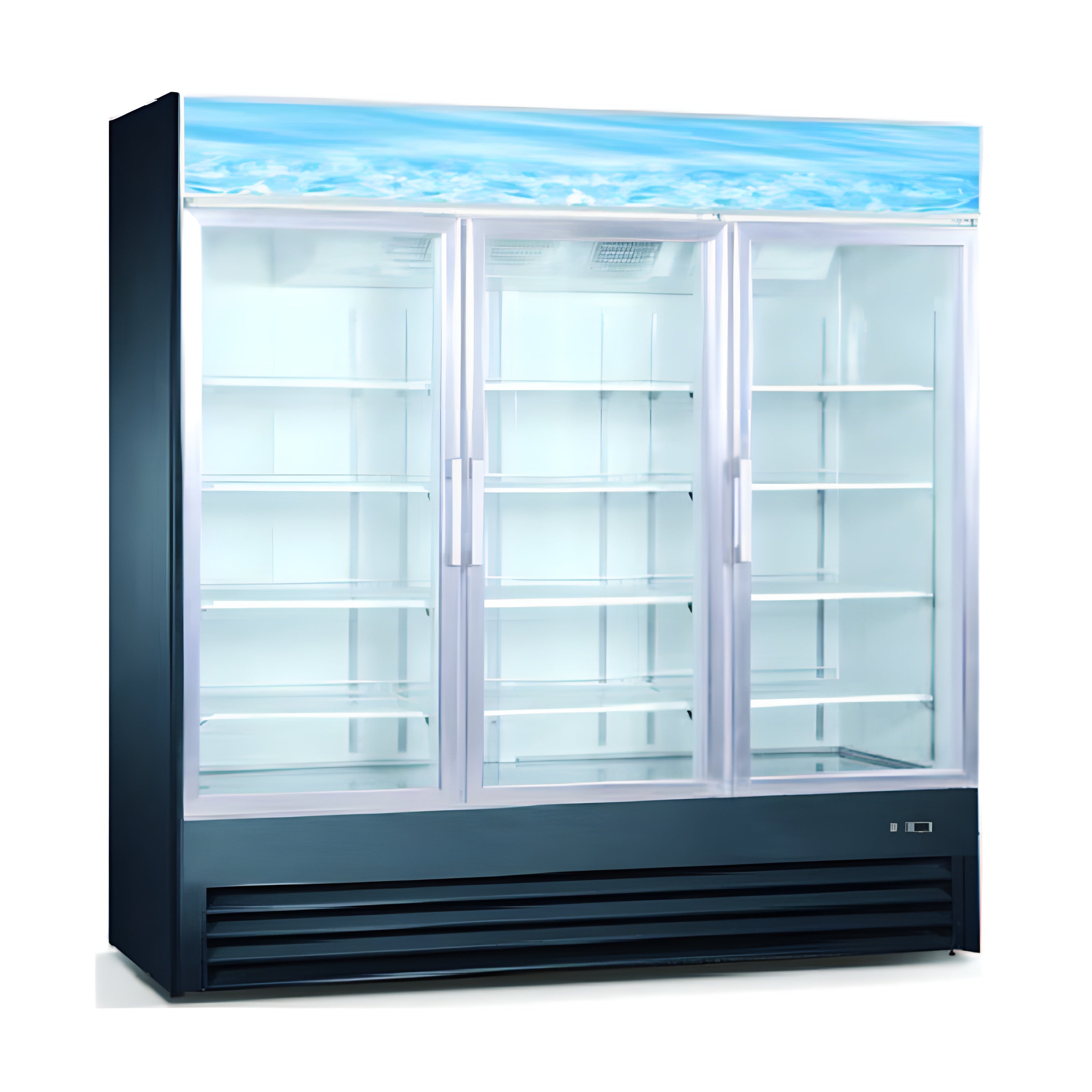 A: Yes, it features three glass swing doors for easy product visibility and access.
