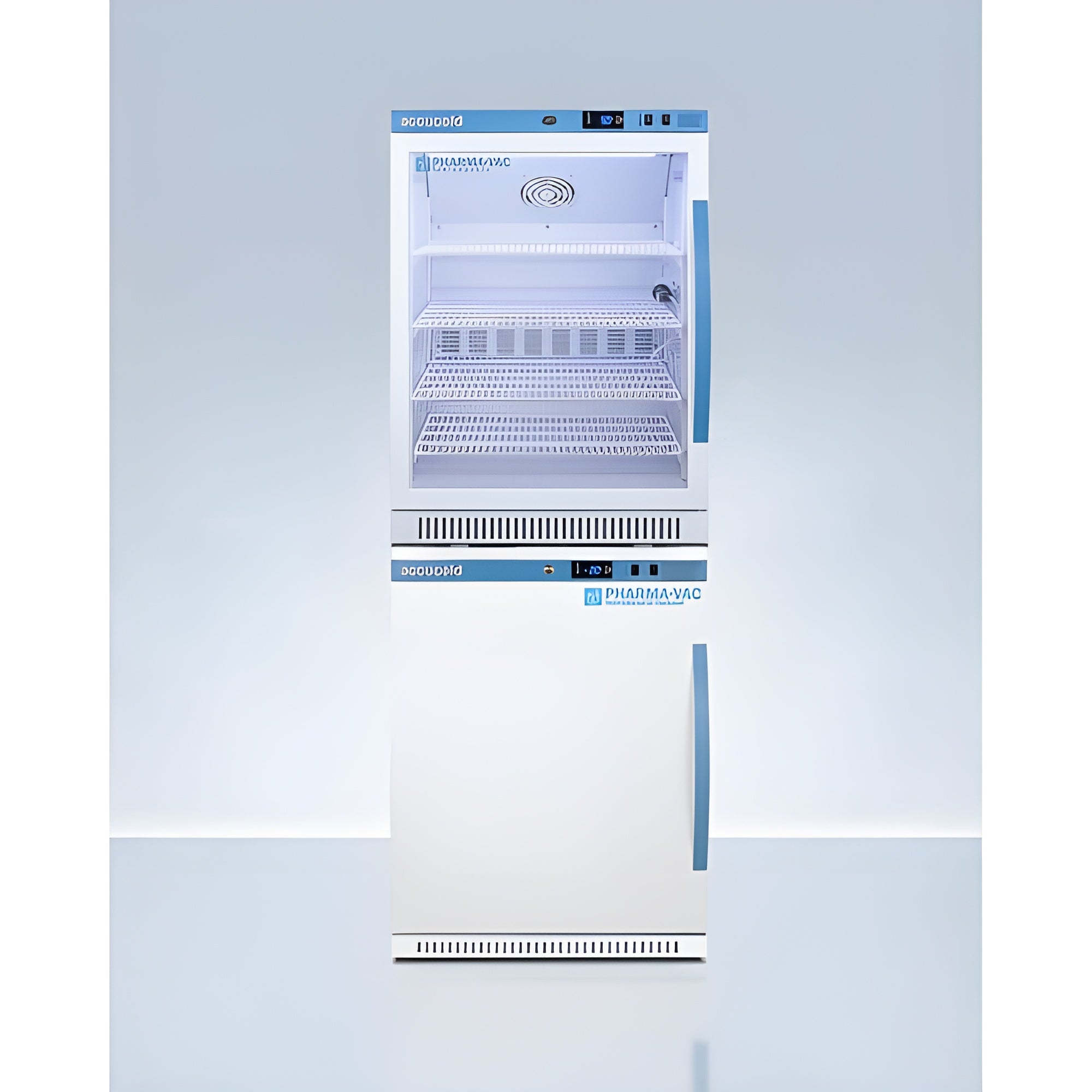 The ARG6PV-AFZ5PVBIADASTACKLHD is a stackable refrigerator-freezer combination designed for vaccine storage and meets CDC/VFC/VFA guidelines. Measuring under 24" wide, it combines a 6 cu.ft. auto-defrost refrigerator with a 3.88 cu.ft. manual-defrost freezer, connected via Accucold's StackRack. Both units feature a microprocessor temperature controller with a refrigerator range of +2 to +8ºC and a freezer range of -30 to -10ºC. A buffered temperature probe in glycol ensures precise temperature readings, while an additional sensor monitors air temperature. Audible and visual alarms notify users of temperature deviations, power failures, and door openings. The refrigerator features adjustable wire shelves, LED lighting, and optimized forced air cooling for stable temperatures. The freezer includes four adjustable shelves and static manual defrost. Factory-installed antimicrobial handles help reduce germs, and a hospital-grade power cord enhances safety. Ships in three boxes with minor assembly required. Both units have left-hand door swings.