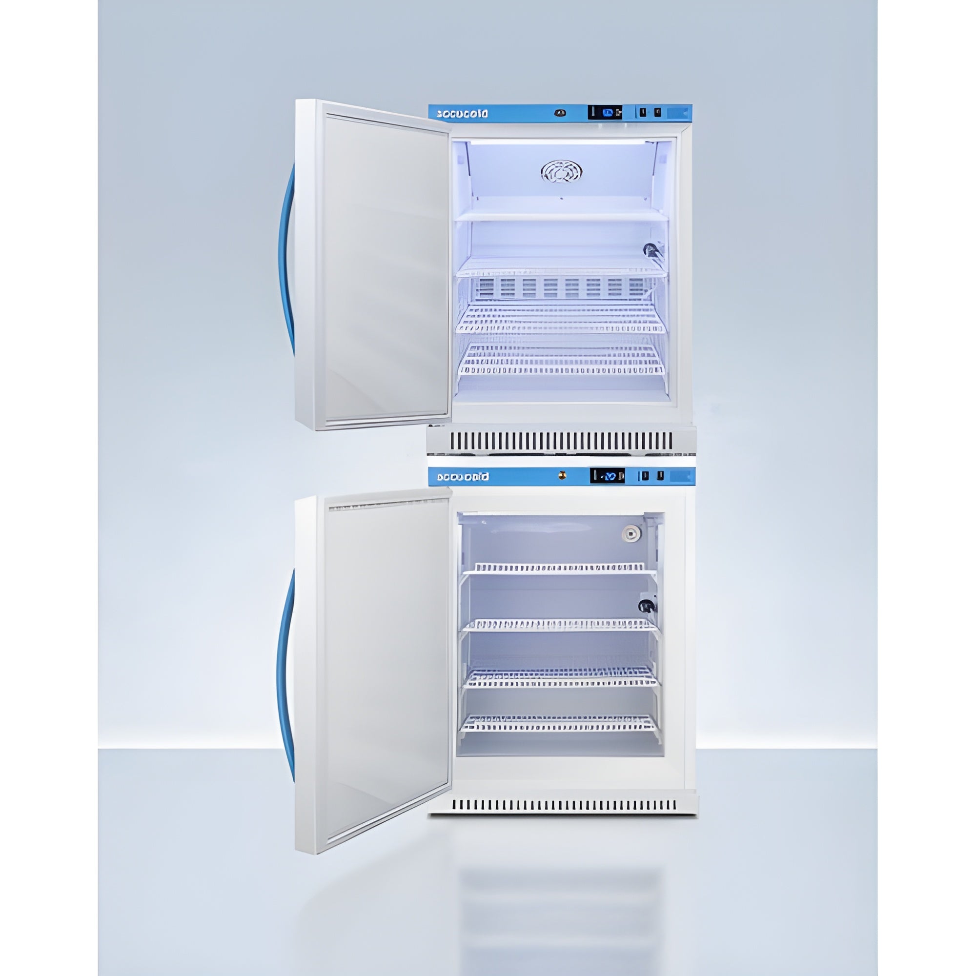 The Accucold ARS6PV-AFZ5PVBIADASTACKLHD offers a stackable refrigerator-freezer combination for vaccine storage, designed to meet CDC and VFC guidelines. This unit features a microprocessor temperature controller with precise temperature ranges for both the refrigerator (+2 to +8ºC) and freezer (-30 to -10ºC). Equipped with audible and visual alarms, including power failure and door open alerts, it ensures safe and accurate storage conditions. The refrigerator's forced air cooling system guarantees temperature stability, while adjustable shelves allow for customizable storage. The freezer, with static manual defrost, provides additional storage space. Both units include antimicrobial handles and hospital-grade safety cords for a cleaner, safer user experience. Stacked together, they offer a compact, efficient solution for managing vaccine storage in compliance with health and safety standards.