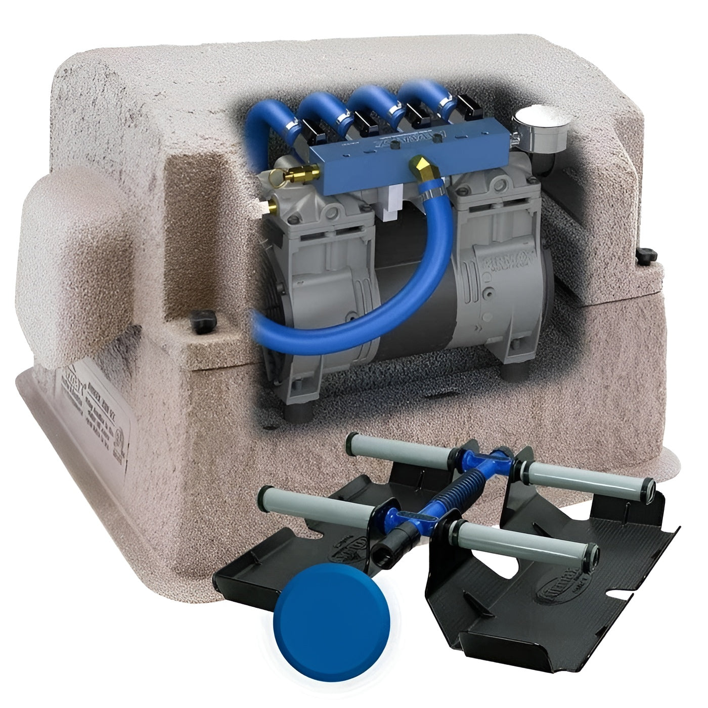 These extremely efficient compressors are available in either 115V or 230V specifications and come equipped with rubber mounts to reduce noise and vibrations, resulting in a quiet operation. With an operating cost of only $35.40 per month, each compressor delivers up to 5.6 CFMs of oxygen to your pond.