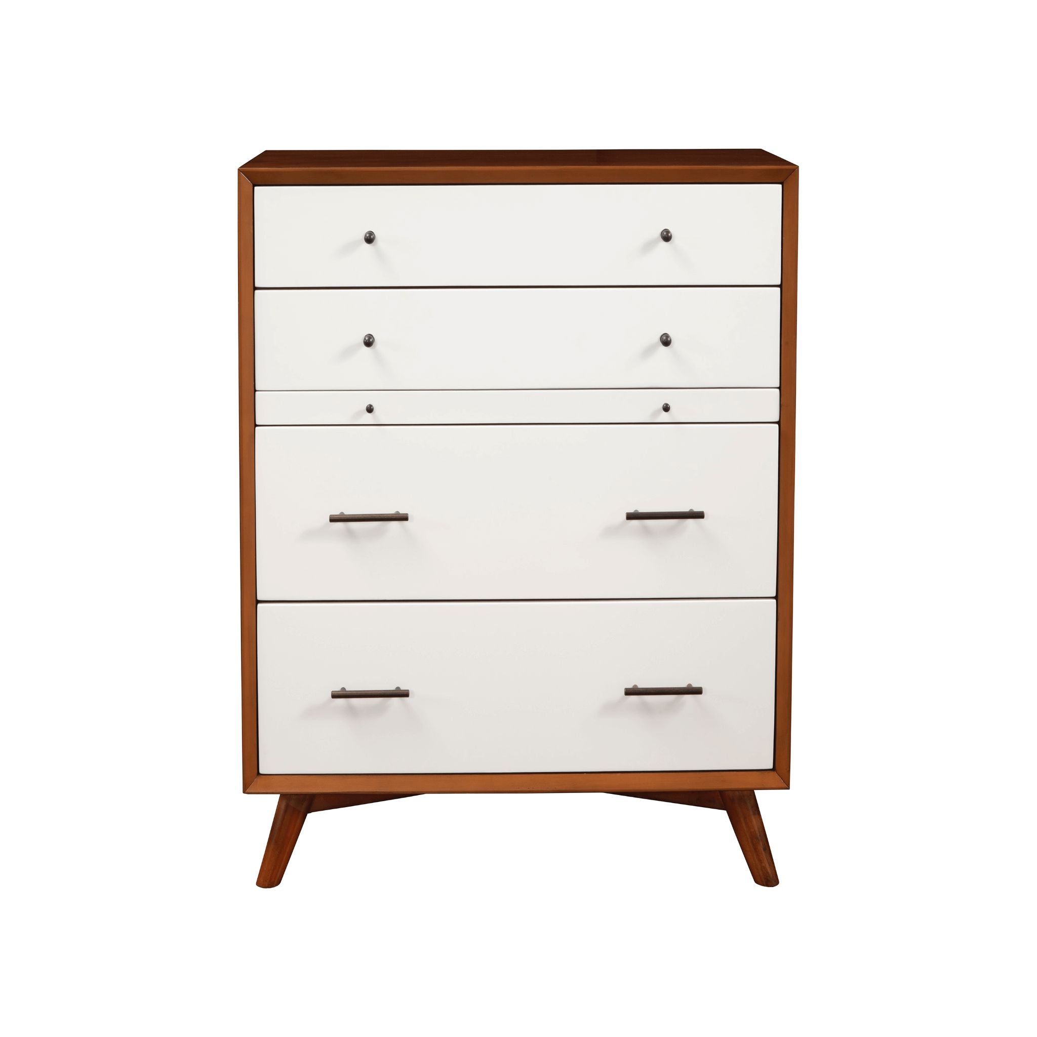 The Flynn collection features the classic lines of Mid-Century Modern furniture that never goes out of style. Its sturdy frames are built to last, constructed of sustainably sourced solid Mahogany solids to ensure a lifetime of use. The Flynn multi-function chest features 4 drawers for storage as well as a functional pull-out shelve. The case pieces in the correlating Flynn bedroom collection all provide a roomy storage solution and make it easy to create a cohesive decorating style or mix and match for a more personalized look. This group combines the Acorn Brown and White finishes for a great looking two-tone option.