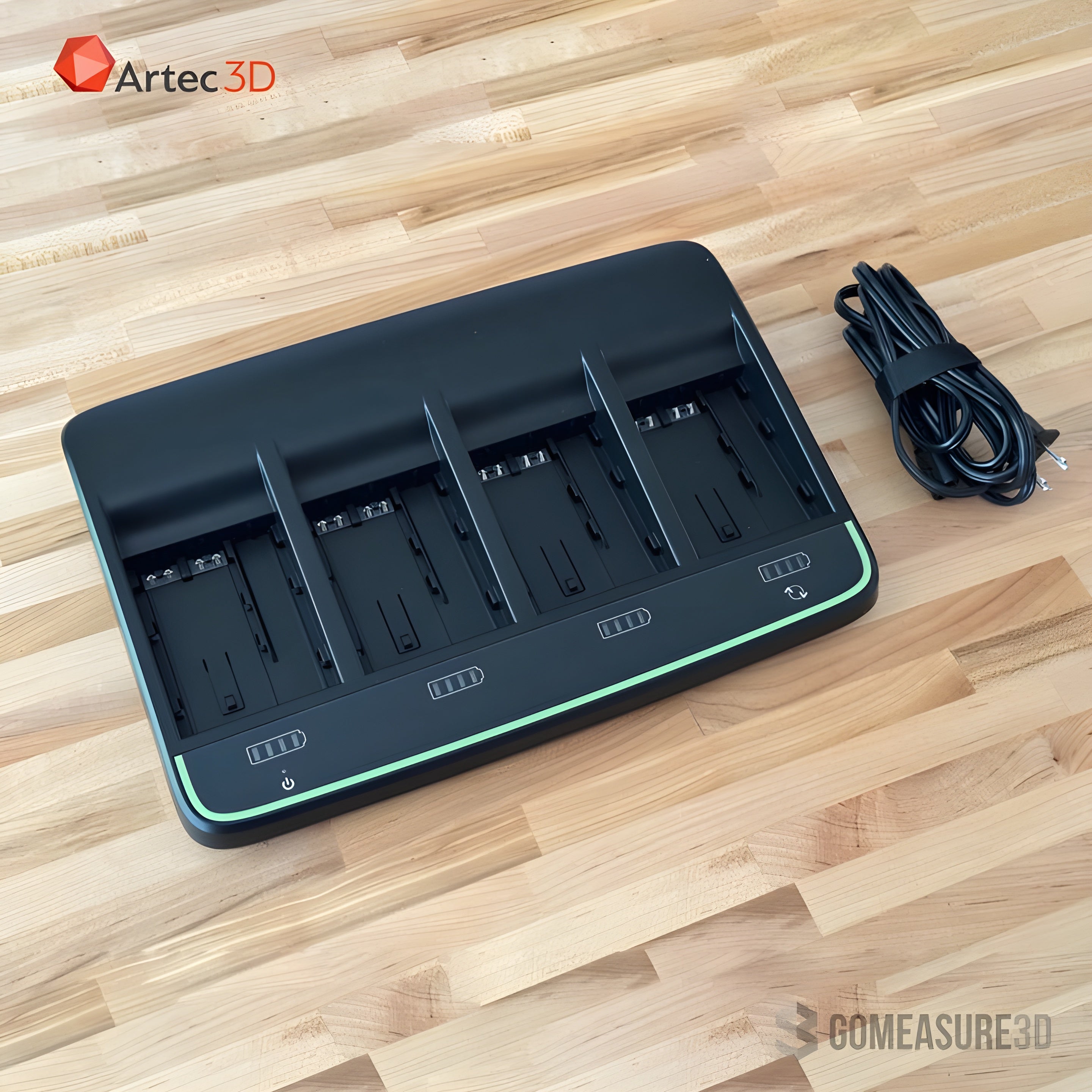 The Artec Ray II Multicharger is an essential accessory designed to efficiently charge multiple batteries for the Artec Ray II 3D scanner, ensuring extended and uninterrupted scanning sessions. Below is a summary of its key features: