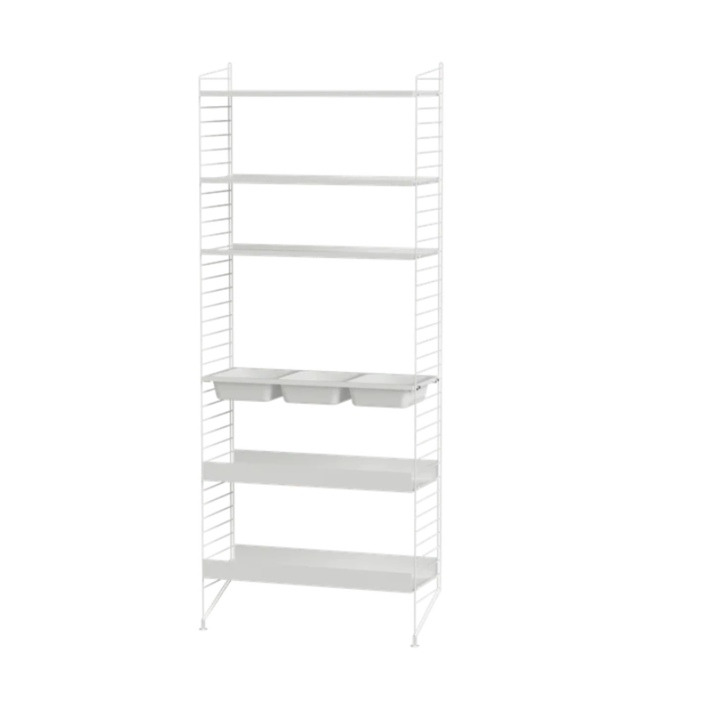 A: The String Bathroom Bundle L is a modular wall-mounted shelving system designed specifically for bathroom storage, combining practical shelving with a sleek Scandinavian design.