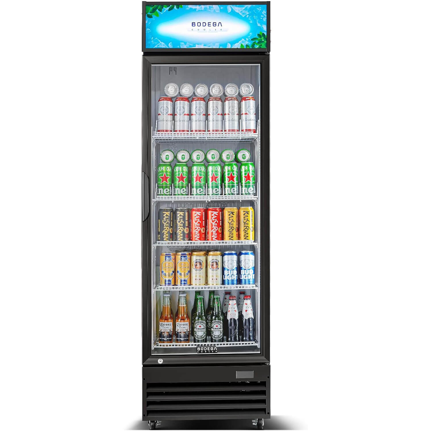 BODEGACOOLER commercial merchandiser refrigerator With a generous 12.5 cu. ft. of space and 5 removable shelves (including 2 drink organizers), you can easily customize your display to showcase your products in the best possible way, which can hold up to 380 cans of standardized soda, beer, or 250 bottles of drinks
