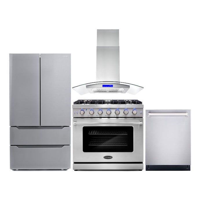 Experience the ultimate in cooking and food storage with Cosmo's premium 4-piece appliance package. This set features a professional-style 36" commercial gas range with a spacious convection oven, a powerful 36" island mount range hood with a curved glass visor, a convenient 24" built-in dishwasher, and a counter-depth 36" French door refrigerator. Enjoy the precision of gas cooking, even heat distribution for perfect baking, efficient ventilation, ample storage space, and a modern design that transforms your kitchen.