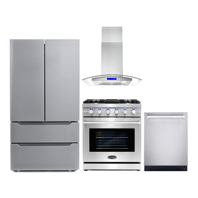 Create a functional and stylish kitchen with Cosmo's 4-piece appliance package. This set features a sleek 30" slide-in gas range with a convection oven, a powerful 30" island mount range hood with a glass visor, a spacious 24" built-in dishwasher, and a counter-depth 36" French door refrigerator. Enjoy the precision of gas cooking, even heat distribution in the oven, efficient ventilation, ample storage space, and a modern design that elevates your kitchen.