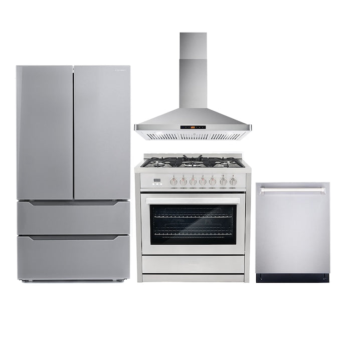 Experience the best of both worlds with Cosmo's premium 4-piece dual fuel appliance package. This set features a powerful 36" commercial-style dual fuel range with a convection oven, a sleek 36" ducted wall mount range hood, a spacious 24" built-in dishwasher, and a counter-depth 36" French door refrigerator. Enjoy the flexibility of gas cooktop power combined with the even heat distribution of an electric oven, alongside modern design elements and convenient features for a kitchen that looks as good as it functions.