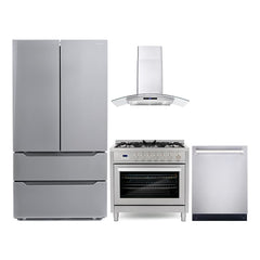 Elevate your kitchen with the Cosmo 4 Piece Kitchen Appliance Package, combining sleek design with advanced features for a modern cooking experience. This comprehensive set includes a 36" Freestanding Gas Range, 36" Wall Mount Range Hood, 24" Built-in Dishwasher, and 36" French Door Refrigerator.
