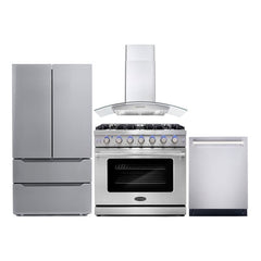 Elevate your kitchen with the Cosmo 4 Piece Kitchen Package. This premium set includes a 36" Freestanding Gas Range, a 36" Wall Mount Range Hood, a 24" Built-in Fully Integrated Dishwasher, and an Energy Star French Door Refrigerator. Designed with top-of-the-line features and high-end performance, this package brings both style and functionality to your cooking space.