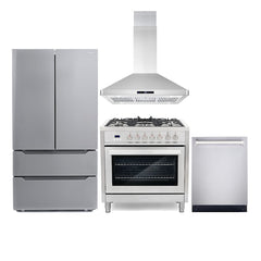 Elevate your culinary space with the Cosmo 4 Piece Kitchen Appliance Package. This package includes a 36" Freestanding Single Oven Dual Fuel Range, a 36" Ducted Wall Mount Range Hood, a 24" Built-In Tall Tub Dishwasher, and a 36" 4-Door French Door Refrigerator. Each appliance is meticulously crafted from premium materials, combining cutting-edge technology, sleek design, and superior performance for an unparalleled cooking and storage experience.