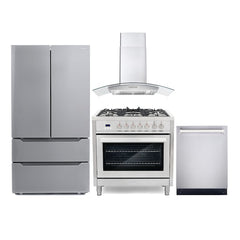 Elevate your culinary space with the Cosmo 4 Piece Kitchen Appliance Package. This package includes a 36" Freestanding Single Oven Dual Fuel Range, a 36" Ducted Wall Mount Range Hood, a 24" Built-In Tall Tub Dishwasher, and a 36" 4-Door French Door Refrigerator. Each appliance is meticulously crafted from premium materials, combining cutting-edge technology, sleek design, and superior performance for an unparalleled cooking and storage experience.