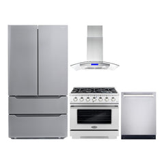 Elevate your kitchen with the Cosmo 4 Piece Kitchen Package. This premium set includes a 36" Freestanding Gas Range, a 36" Wall Mount Range Hood, a 24" Built-in Fully Integrated Dishwasher, and an Energy Star French Door Refrigerator. Designed with top-of-the-line features and high-end performance, this package brings both style and functionality to your cooking space.