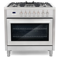 Cook for the whole family with less time and effort. Cosmo’s F965 36 in. Freestanding Single Oven Dual Fuel Range features a 5 sealed gas burner cooktop and a spacious 3.8 cu. ft. electric oven capacity. The sealed gas burners range from 5,000 BTU for precise heat and simmering delicate sauces to a powerful 18,000 BTU triple ring burner to provide high heat for cooking meat and boiling water. The 3.8 cu. ft. True European Convection electric oven has 8 functions, including defrost, pizza, and convection bake modes, to deliver perfectly cooked meals every time. Our gas range features overheating protection and a cool-to-touch oven door handle so you can cook with peace of mind. Thanks to the removable backsplash, this 36 in. dual fuel range can be used for either freestanding or slide-in installations. Trust Cosmo to deliver professional quality and design at factory direct prices.