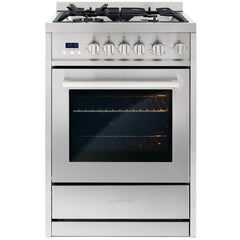 A smaller space doesn’t mean you have to sacrifice professional design. Cosmo’s 24 inch Compact Gas Range in Stainless Steel delivers high performance and proven quality. The cooktop features 4 sealed burners that allow you to create culinary masterpieces from start to finish: one 17,400 BTU triple ring burner, two 6,900 BTU semi-rapid burners, and one 5,000 BTU auxiliary burner. The large 2.73 cu. ft. oven is equipped with rapid convection, delivering superior results you can taste. A built in display and electronic controls let you set the clock and timer for precision cooking.