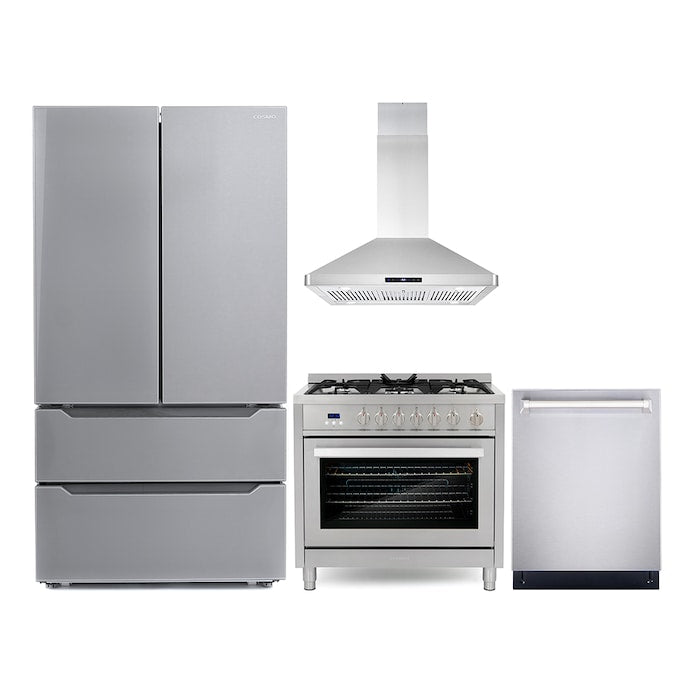 Elevate your kitchen with a complete suite of premium Cosmo appliances designed for modern living. This package includes a professional-style 36" gas range, a sleek 36" island range hood, a spacious 24" built-in dishwasher, and a counter-depth 36" French door refrigerator.