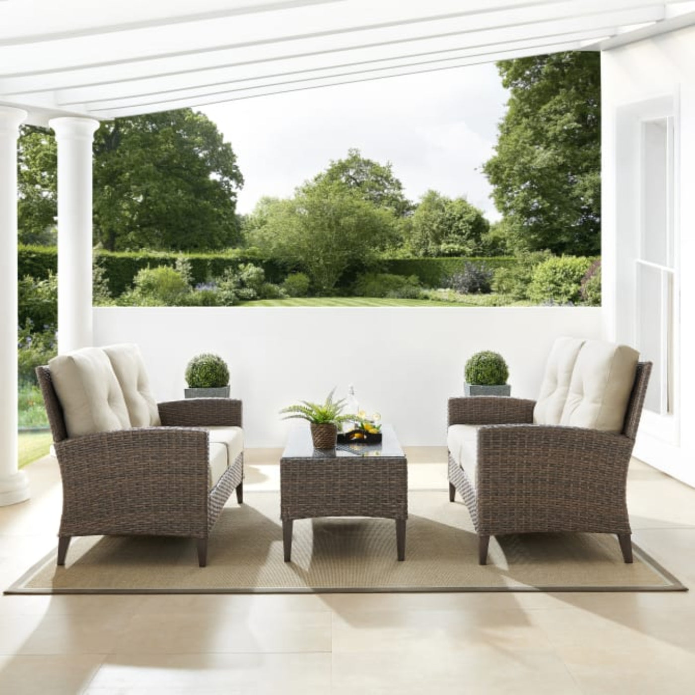 Great for entertaining or lounging with friends, the Rockport 3pc Conversation Set features two loveseats and a coffee table made of all-weather resin wicker over powder-coated steel frames. The coffee table is topped with tempered glass, adding just the right amount of table space for resting a cool drink. All perched atop steel tapered legs hand painted to look like real wood, the Rockport conversation set brings classic style to your outdoor oasis without sacrificing durability.