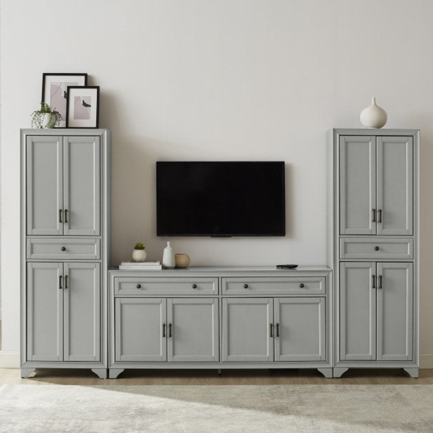 Whether you love a traditional look or a modern farmhouse vibe, the Tara 3pc Entertainment Set is a stylish take on a classic entertainment center. The sideboard features two wide full-extension drawers and two large cabinets with adjustable shelves. Each storage cabinet also has a full-extension drawer and two large cabinets with adjustable shelving. The Tara 3pc Entertainment Set is a great storage option for framing large TVs up to 65".