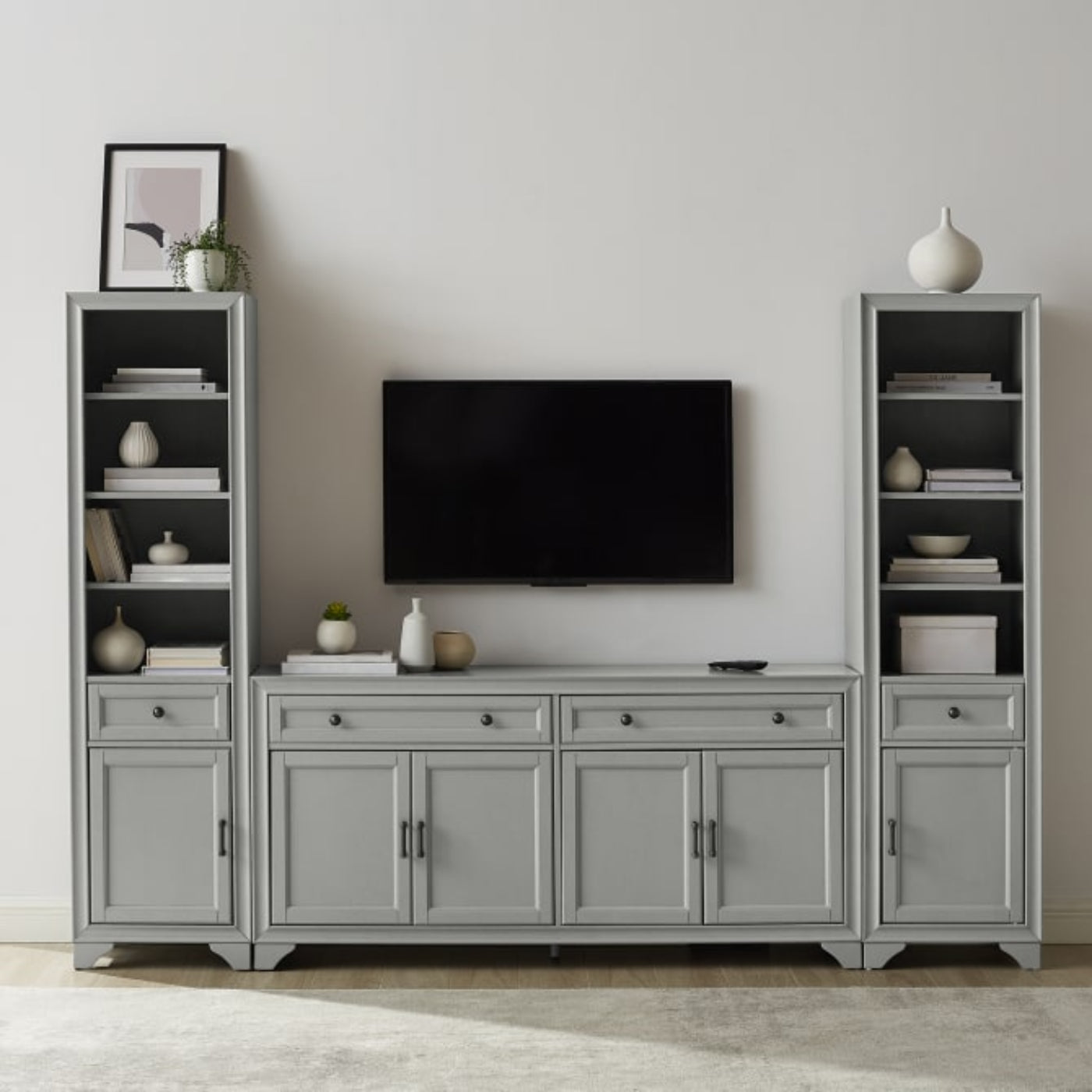 Whether you love a traditional look or a modern farmhouse vibe, the Tara 3pc Entertainment Set is a stylish take on a classic entertainment center. The sideboard features two wide full-extension drawers and two large cabinets with adjustable shelves. Each bookcase has a full-extension drawer and three open adjustable shelves. The Tara 3pc Entertainment Set is a great storage option for framing large TVs up to 65".