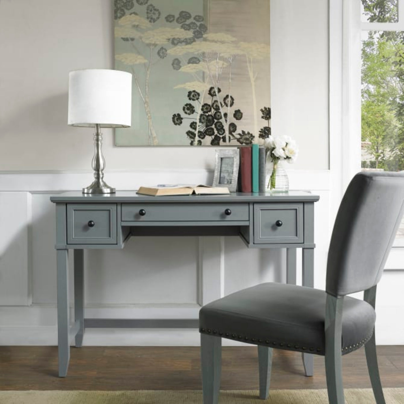 Simple and traditional, the elegant silhouette of the Vista Desk complements a variety of decor. With a spacious workspace and three easy glide drawers, this desk is ideal for a small home office or command center. The Vista Desk can also be used as a charming vanity table, making it as versatile as it is stylish.
