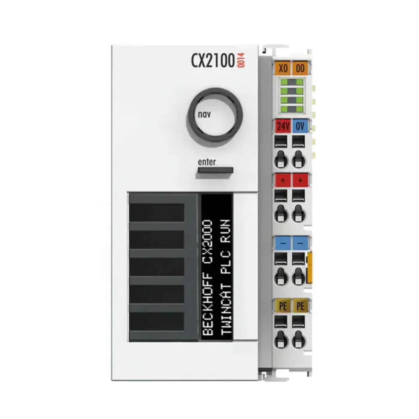 The CX2100-0014 power supply module is used for supplying power to the components (CPU modules, system and extension modules) of a CX20xx system. The power supply module is controlled via TwinCAT. An FSTN LC display with 2 x 16 characters and a selector switch as well as an enter key allow the querying of internal status values as well as self-created display parameters or menus with and without input options. EtherCAT or Bus Terminals can be connected on the right-hand side – the respective bus system is detected automatically and operated by the CPU. Power is supplied to the E-bus or K-bus electronics in the I/O terminals by an integrated but internally separate power supply unit with 2 A at 5 V DC. The CX2100-0014 is in principle passively cooled, has no fan and is intended for operation in the extended temperature range from -25 to +60 °C. The powerful CX2100-0014 power supply unit offers a maximum output of 130 W. Thanks to its wider housing front the CX2100-0014 also allows passive ventilation through the front and is thus also suitable for horizontal mounting positions. Optionally, the CX2020 or CX2030 systems can be equipped with active ventilation (fan option) for better heat dissipation, thus enabling operation in different ambient conditions in combination with a CX2100-0014 power supply unit.