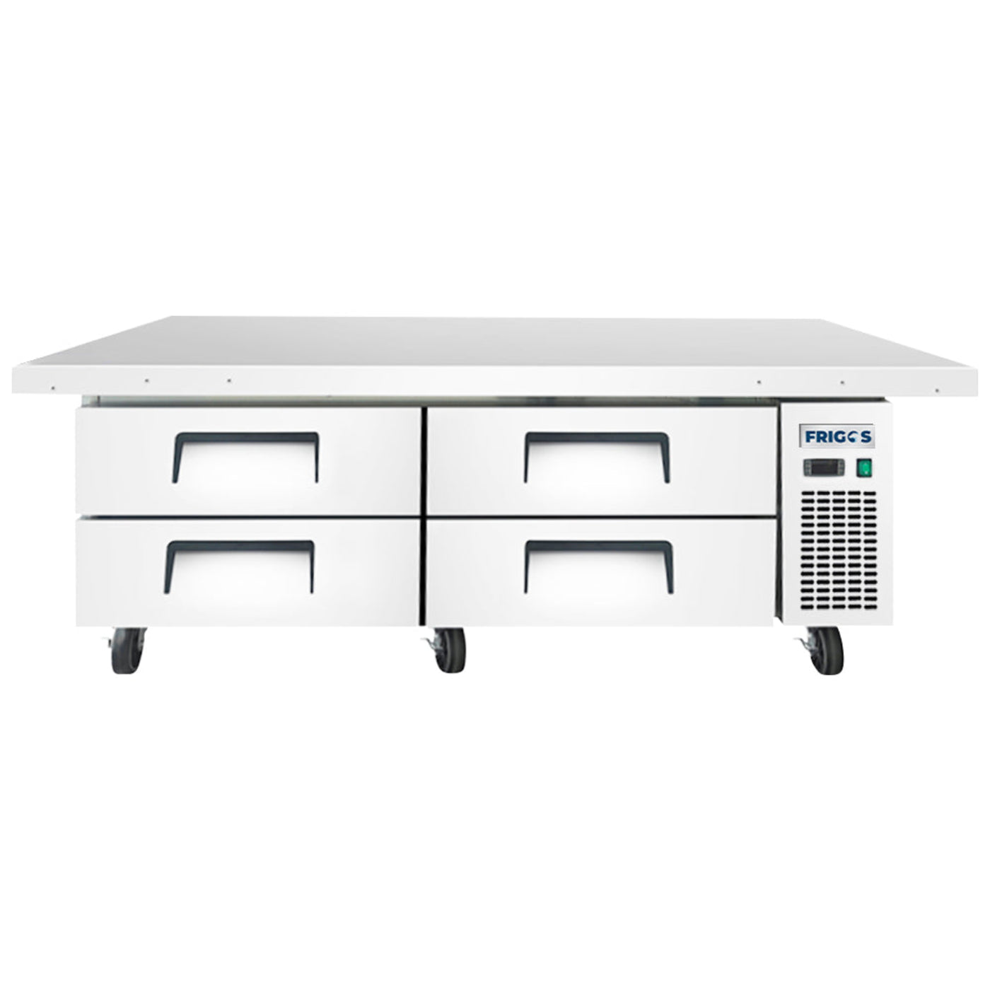 A: The Frigos FGA-CB-4DR-78 is a commercial-grade refrigerated chef base designed to provide efficient cold storage and additional workspace in kitchens with limited space. It features a 76-inch width with four drawers and an extended top, offering ample storage for refrigerated ingredients and extra workspace for countertop cooking equipment.