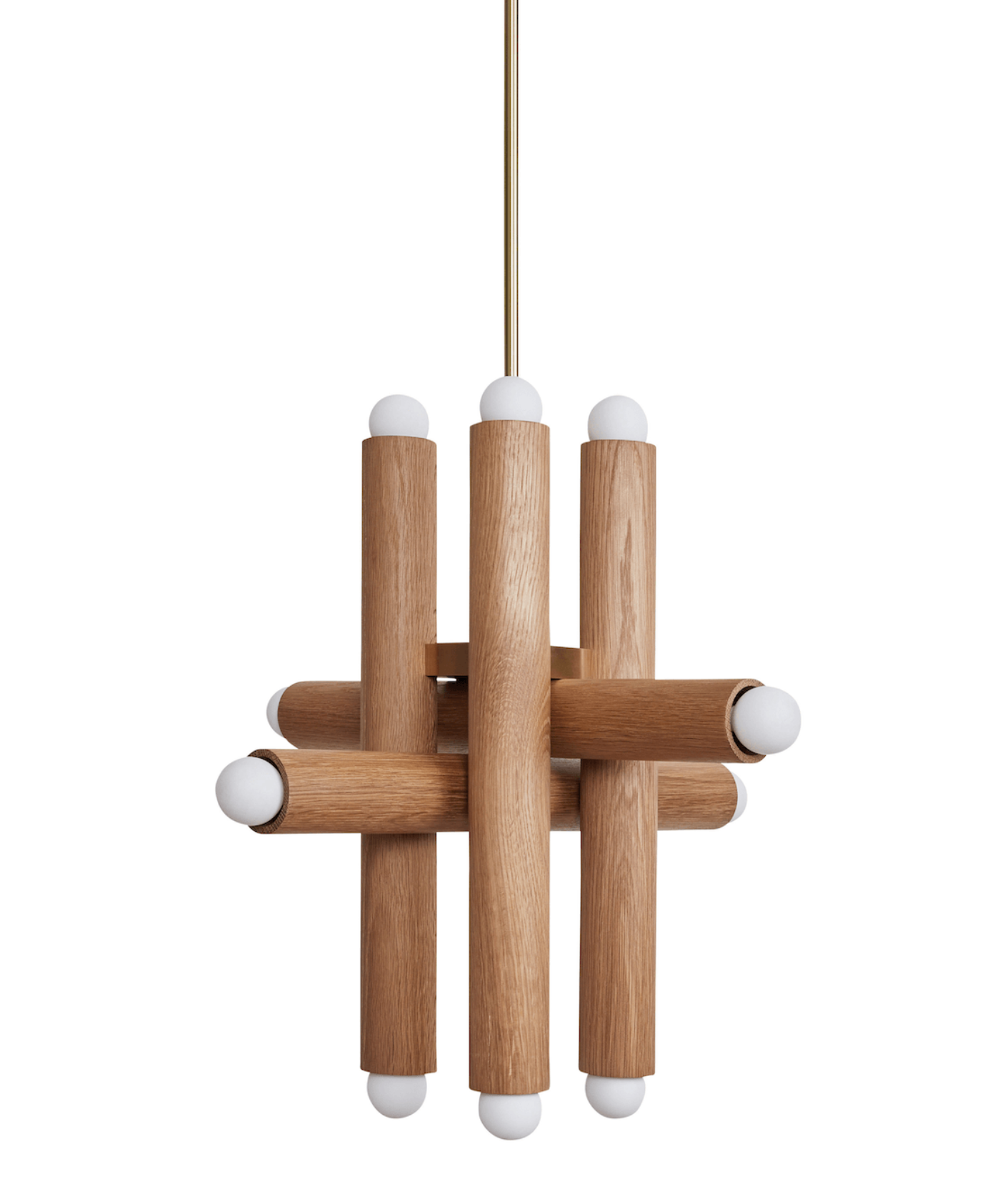 Workstead Hieroglyph Pendant XII expands into a thicket of wooden canisters, casting light in all directions. While its bold presence makes a statement, the delicate metal rod provides balance, allowing it to effortlessly branch out above any dining area. Additionally, the fixture is crafted from domestically sourced natural oak, ensuring durability and uniqueness in every piece. Since each fixture showcases distinct variations in tone, color, and grain, no two are exactly alike. Furthermore, the Workstead Hieroglyph Pendant XII is UL, cUL, and CE listed and damp rated, making it a safe and versatile choice for modern interiors.