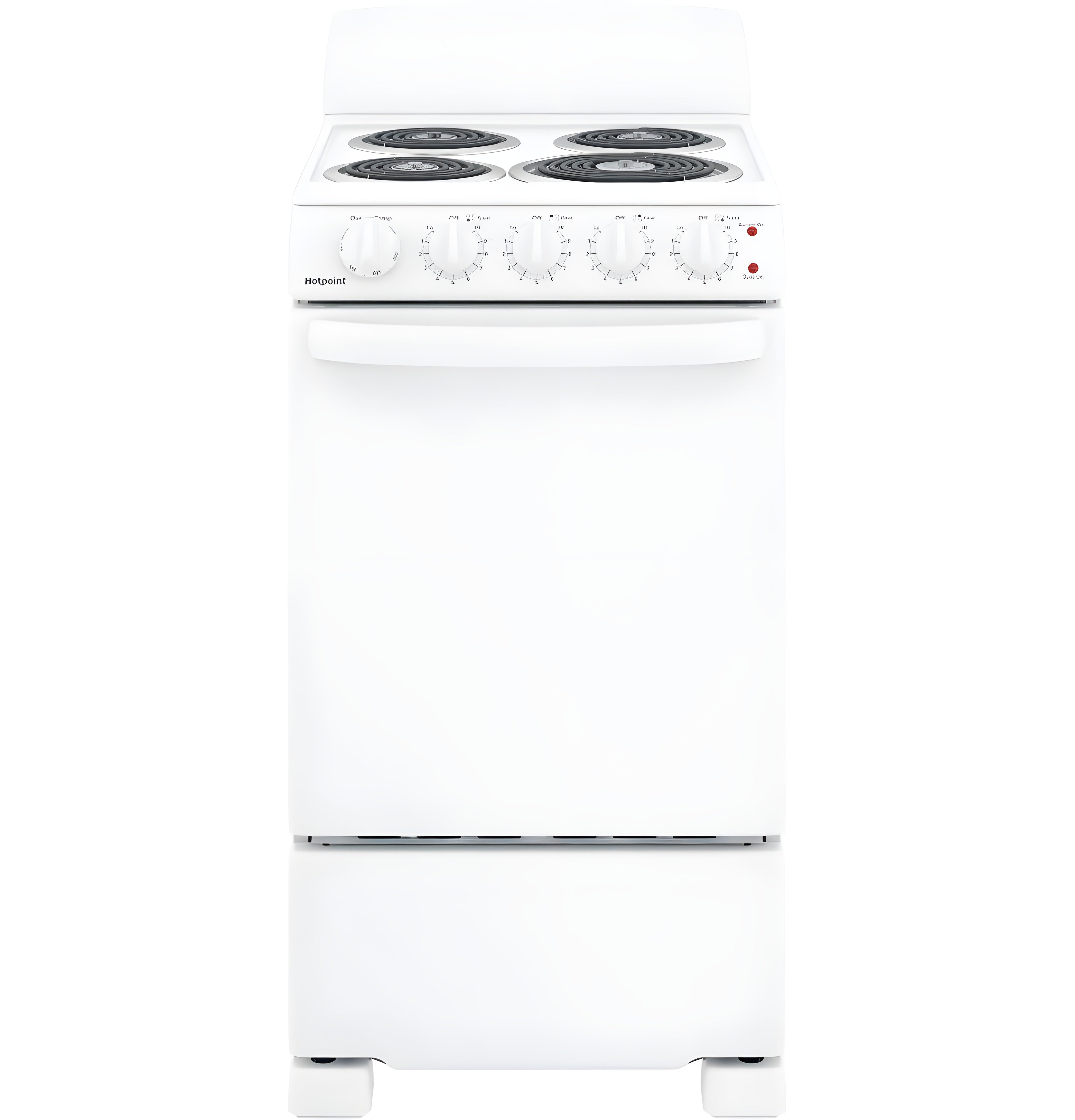 A: The HOTPOINT RAS200DMWW is a 20" electric free-standing range featuring front-control knobs, a standard clean oven, and two coil burners for reliable everyday cooking. It comes in a white finish, offering a classic and compact solution for small kitchens.