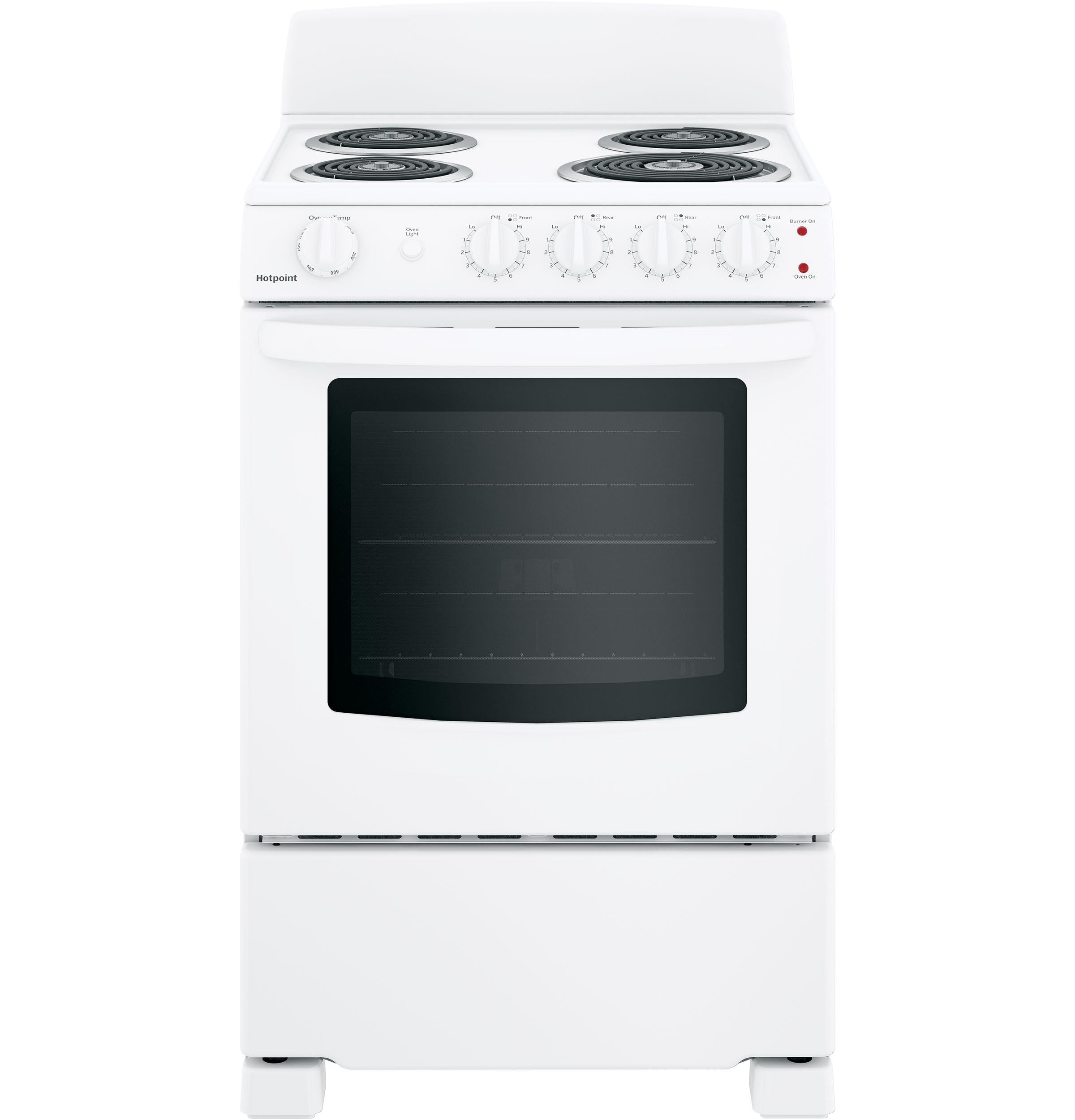 A: The HOTPOINT RAS240DMWW is a 24" free-standing electric range with front-control knobs. It features four coil burners, a spacious oven, and a sleek white finish. The front-control design allows for easy access and control while cooking.