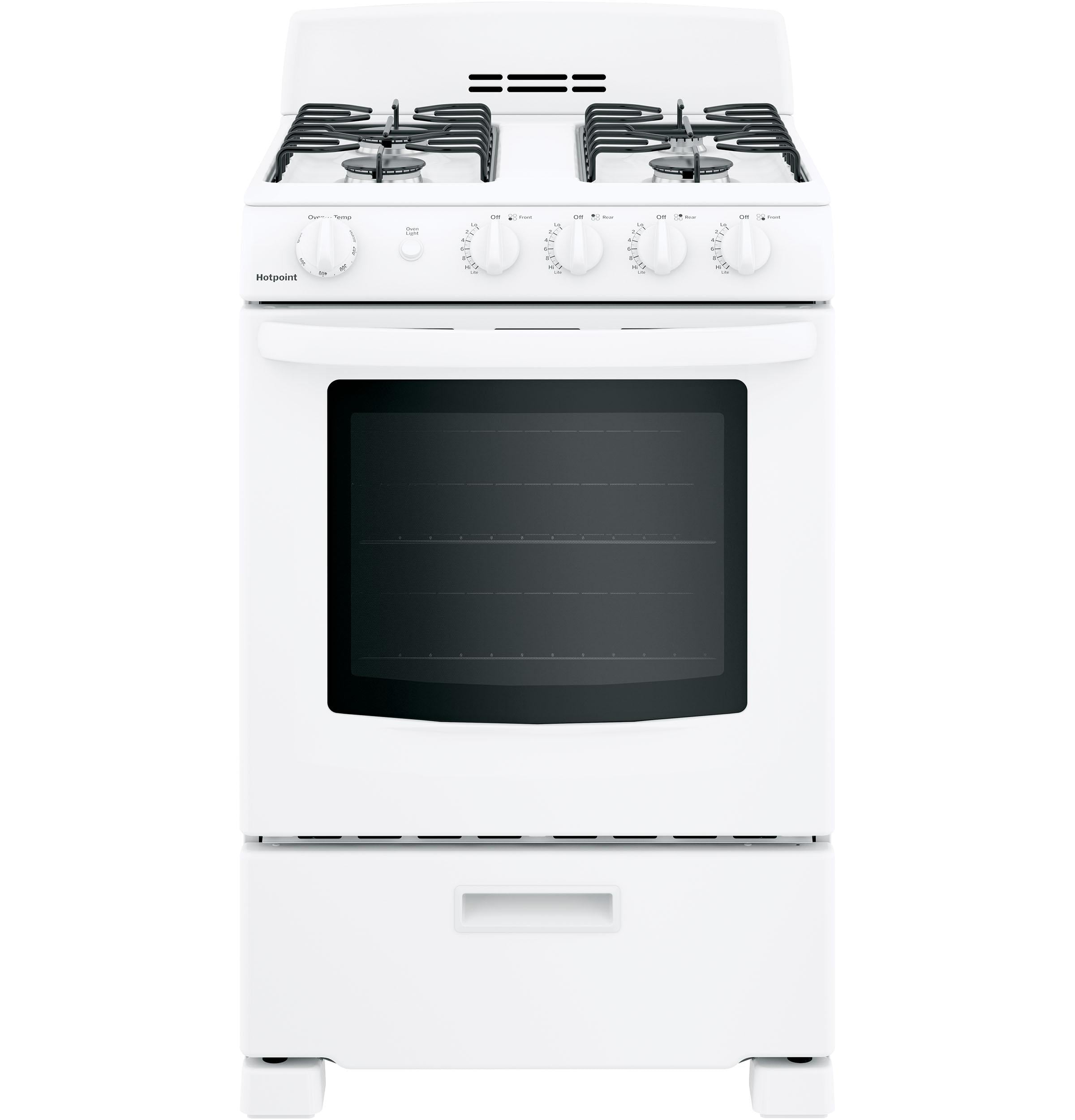 A: The HOTPOINT RGAS300DMWW is a 24" front-control free-standing gas range featuring a large oven window for easy monitoring, 4 sealed burners, and front-mounted controls for convenient operation. Its white finish and compact size make it ideal for smaller kitchens.