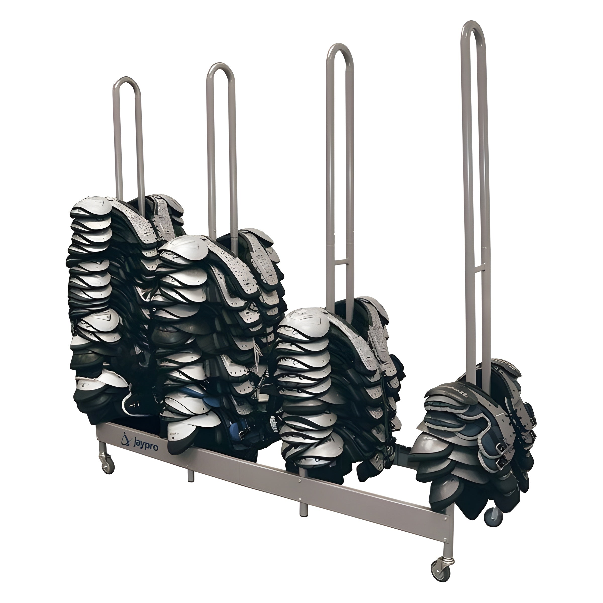 A: The Jaypro StackMaster Shoulder Pad Deluxe Rack is a durable storage solution designed to hold up to 80 shoulder pads, keeping them organized and easily accessible.