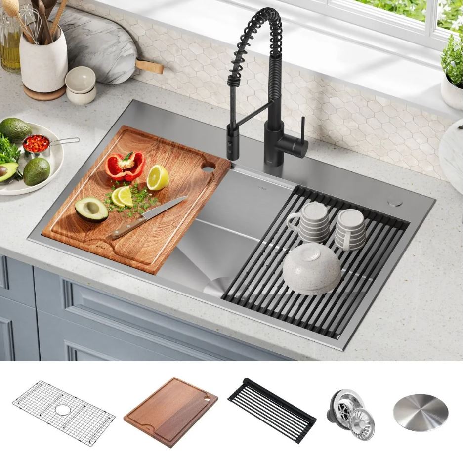 A: The KRAUS Kore KWT330-33 is a 33" drop-in workstation sink with a spacious single bowl, crafted from ultra-durable 16-gauge T304 stainless steel.