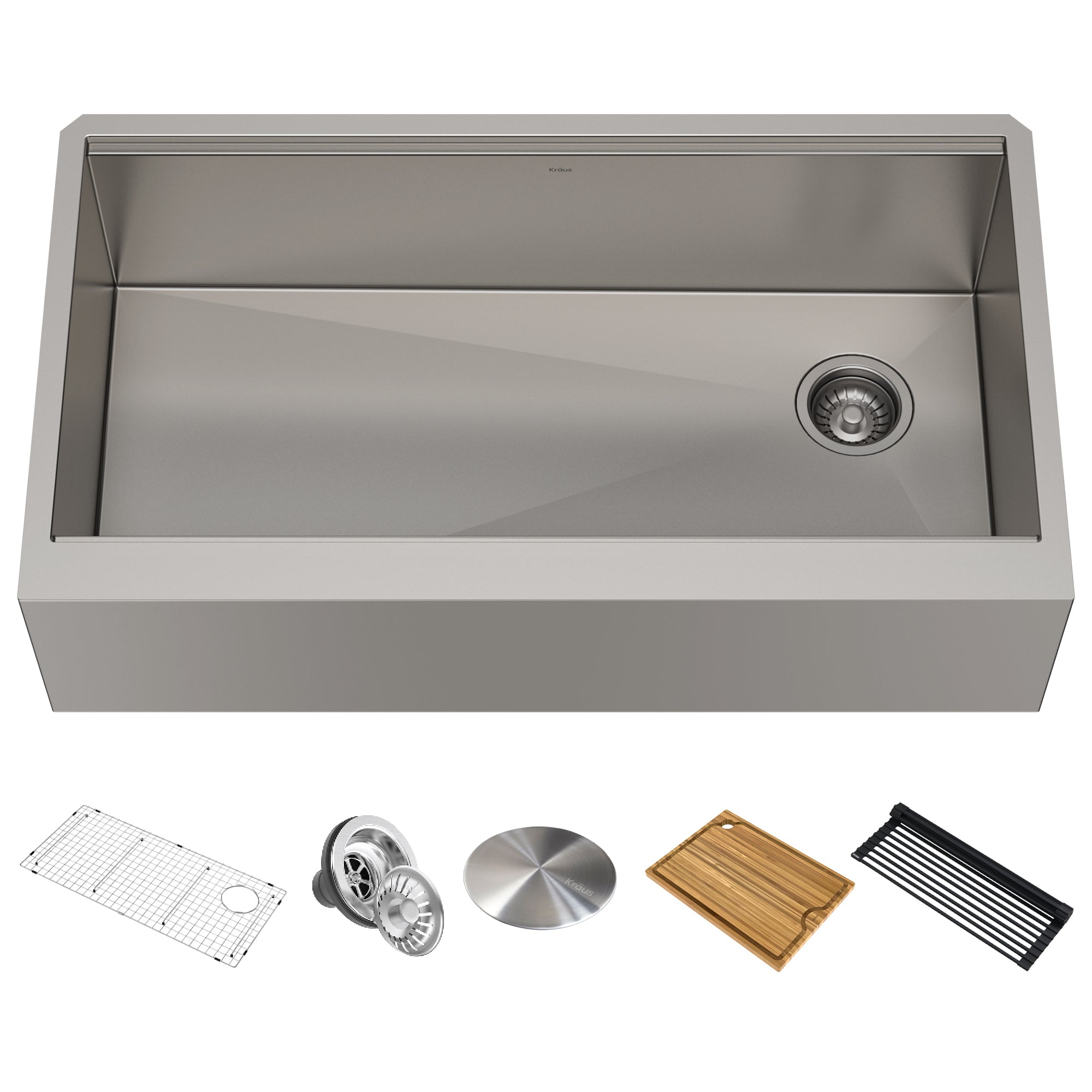 Do more with Kore - The ultimate sink for the modern home chef. Inspired by professional kitchens, the Kore Workstation Series instantly transforms your kitchen sink into a full-service prep station. With an impressive flat apron front design, this farmhouse sink creates a focal point with a distinctive modern look. Packed with premium accessories such as the multi-purpose dish drying rack and bamboo cutting board, the integrated ledge system allows you to wash and dry, or chop and slice without losing an inch of counter space. Made with real 16-gauge stainless steel, this kitchen workhorse is one of the toughest and most durable sinks on the market. The advanced modern look and culinary-inspired design is an instant upgrade to any home kitchen. Take the functionality of your kitchen sink to a whole new level with the Kore Workstation Series and experience the KRAUS difference.