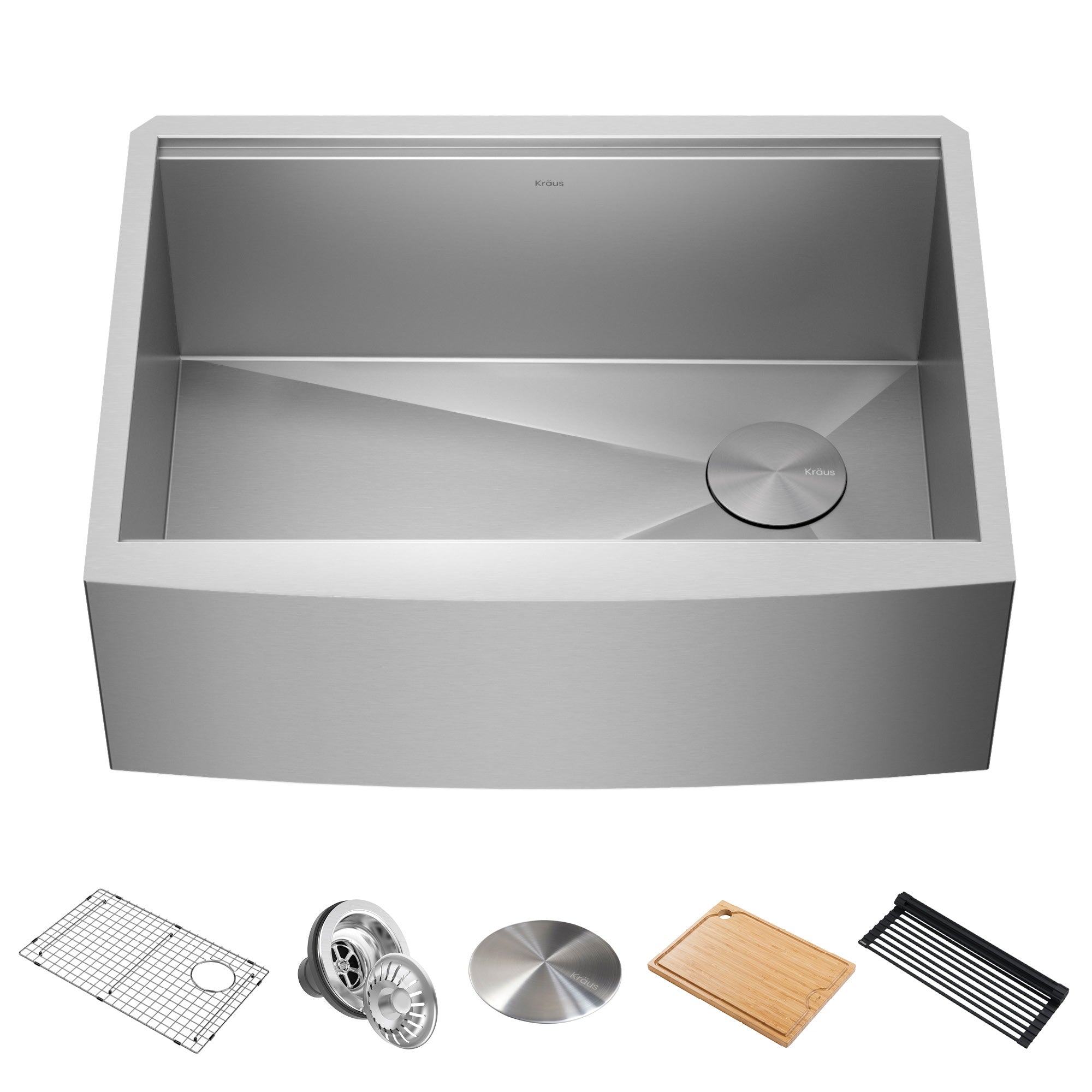 Cook, serve, and entertain in style with KRAUS Kore Workstation Sinks. Engineered with an integrated ledge to support custom sliding accessories, this sink creates a multifunctional workspace to streamline all your kitchen tasks from meal prep to cleanup. The sink kit includes a heavy-duty cutting board and roll-up dish rack that allow you to work right over the sink without losing any space on the kitchen counter. Featuring a clean, classically-inspired rounded apron front, this farmhouse sink creates a focal point with a distinctive modern look that fits perfectly into any environment, from traditional to transitional to urban kitchens. Installs as an undermount for a seamless transition between sink and countertop, with no exposed mounting deck to trap food for easy cleaning.
