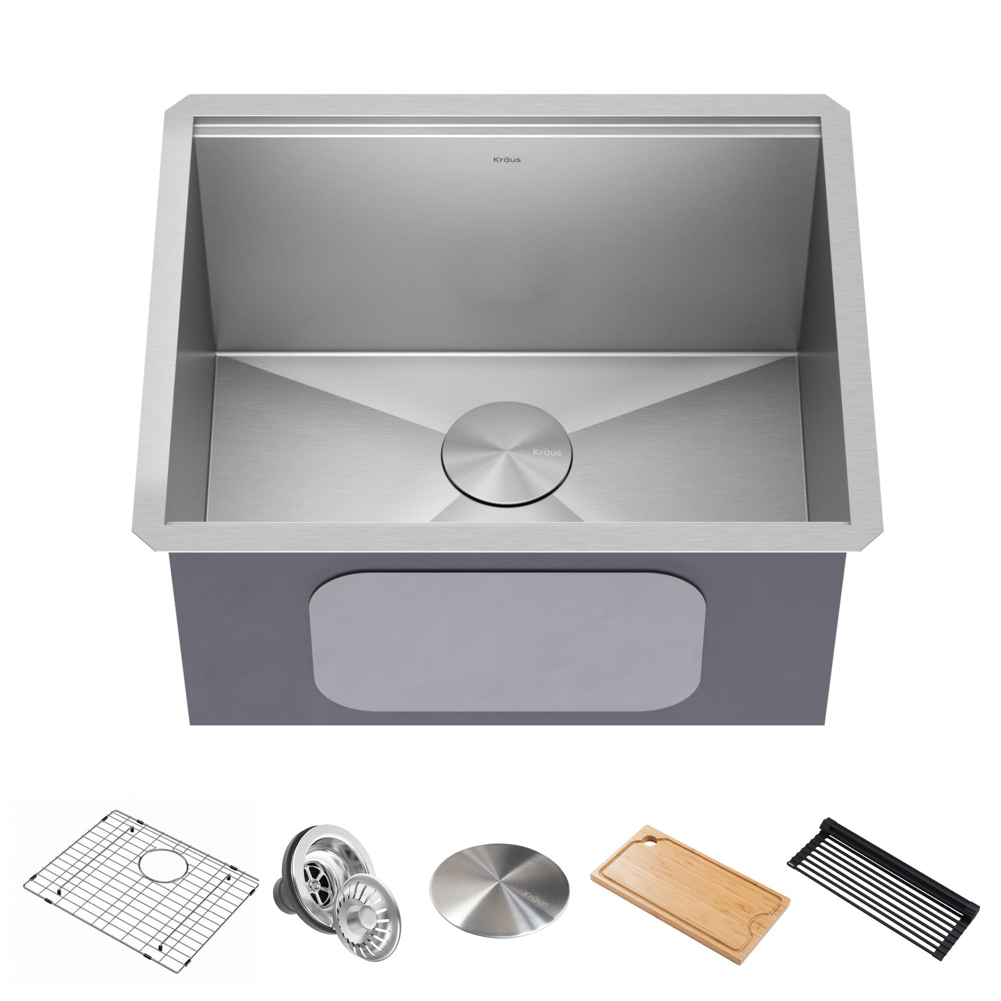 Transform the way you tackle messy tasks with a KRAUS Kore Workstation Laundry Utility Sink. Ideal for any mud room, workshop, or laundry room, this sink is engineered with an integrated ledge to support sliding accessories, creating a multifunctional workspace to streamline workflow when it's time to roll up your sleeves. The kit includes a heavy-duty cutting board that provides additional workspace, while the rollup drying rack makes a perfect place for drying items over the sink. Featuring a 12" deep single bowl, this sink is large enough to handle the toughest jobs, including soaking laundry, watering plants, and even bathing the dog! Undermount installation creates a seamless transition between sink and countertop with no exposed mounting deck to trap dirt, with tight-radius corners for a clean modern look. Made with KRAUS TRU16 the thickest 16 gauge stainless steel for maximum durability and NoiseDefend sound dampening pads to absorb noise and vibration for an ultra-quiet experience. Wear-resistant finish is easy to clean and not prone to corrosion, while rounded corners on the bottom of the sink reduce buildup over time. Channel grooves and a sloped bottom improve drainage, with a rear center set drain for more storage space below the sink. The installation-ready sink comes with a protective stainless steel bottom grid and drain assembly with matching cover for a clean look