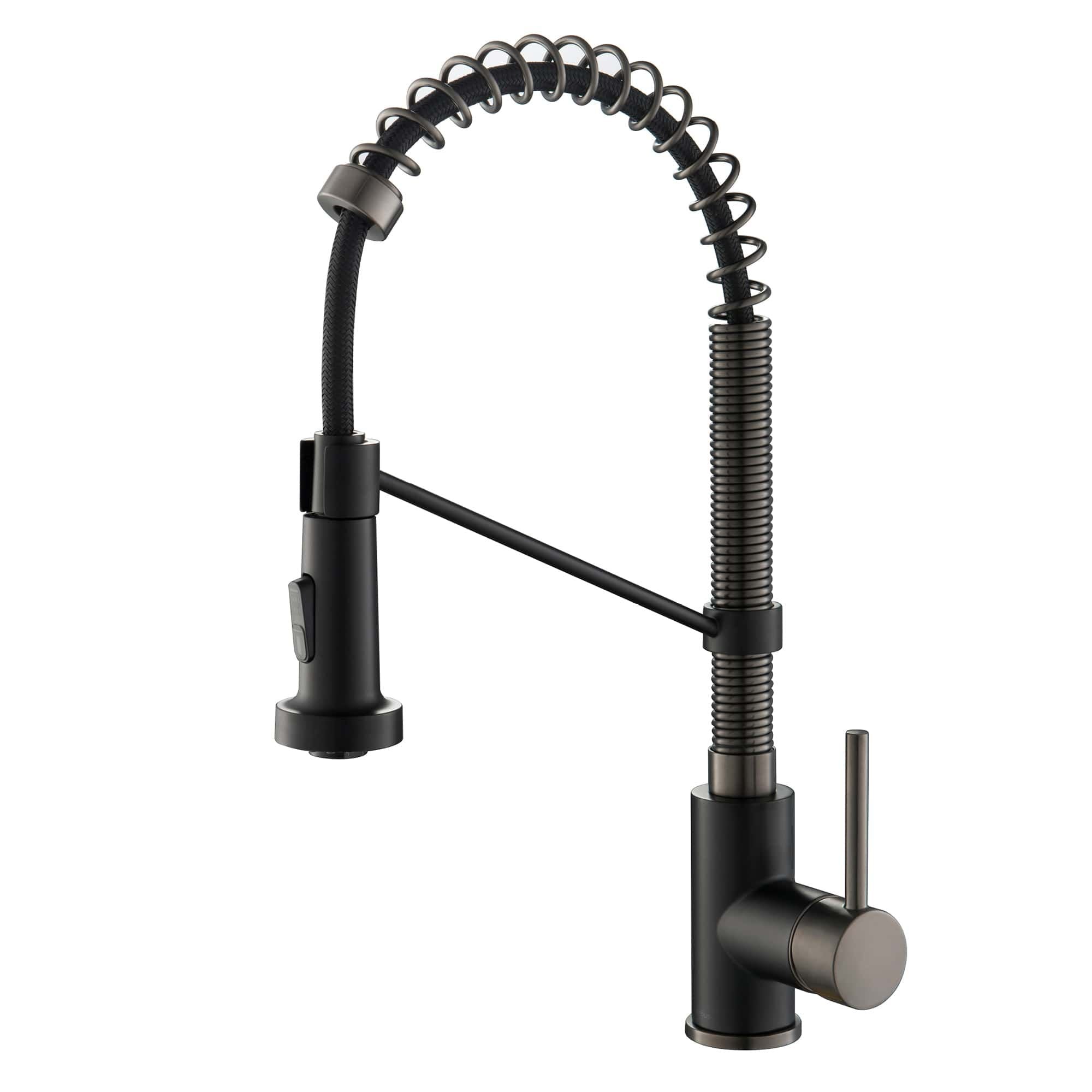 The Bolden commercial-style faucet creates a captivating industrial look with a high-arc open coil spout, and offers the advantage of a compact 18" height that fits underneath most kitchen cabinets. The highly functional design features a pull-down sprayhead with Reach technology for superior maneuverability and an extended range of motion, allowing you to reach all around the kitchen sink. The dual function sprayer switches between an aerated stream for filling pots and pitchers, and a powerful spray to rinse dishes and wash away stubborn food residue. Heavy-duty construction and premium components ensure long-lasting worry-free use. For the ultimate installation convenience, Bolden comes with pre-attached waterlines and all mounting hardware included. Experience Kraus Quality in your own kitchen, and Go Bold with Bolden