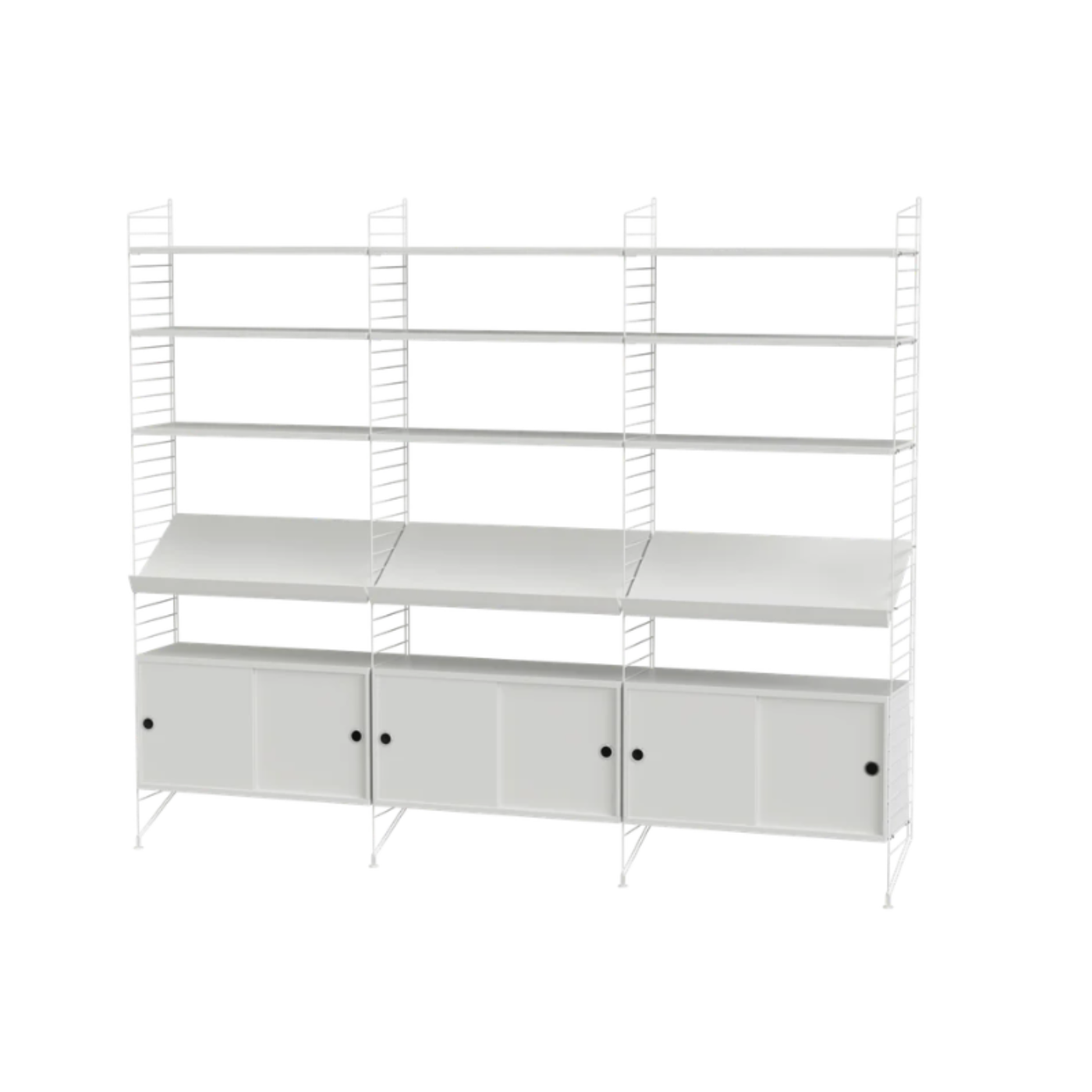 A: A ready-made modular shelving setup designed by Nils Strinning, combining shelves, cabinets, and magazine racks in a clean, Scandinavian aesthetic.