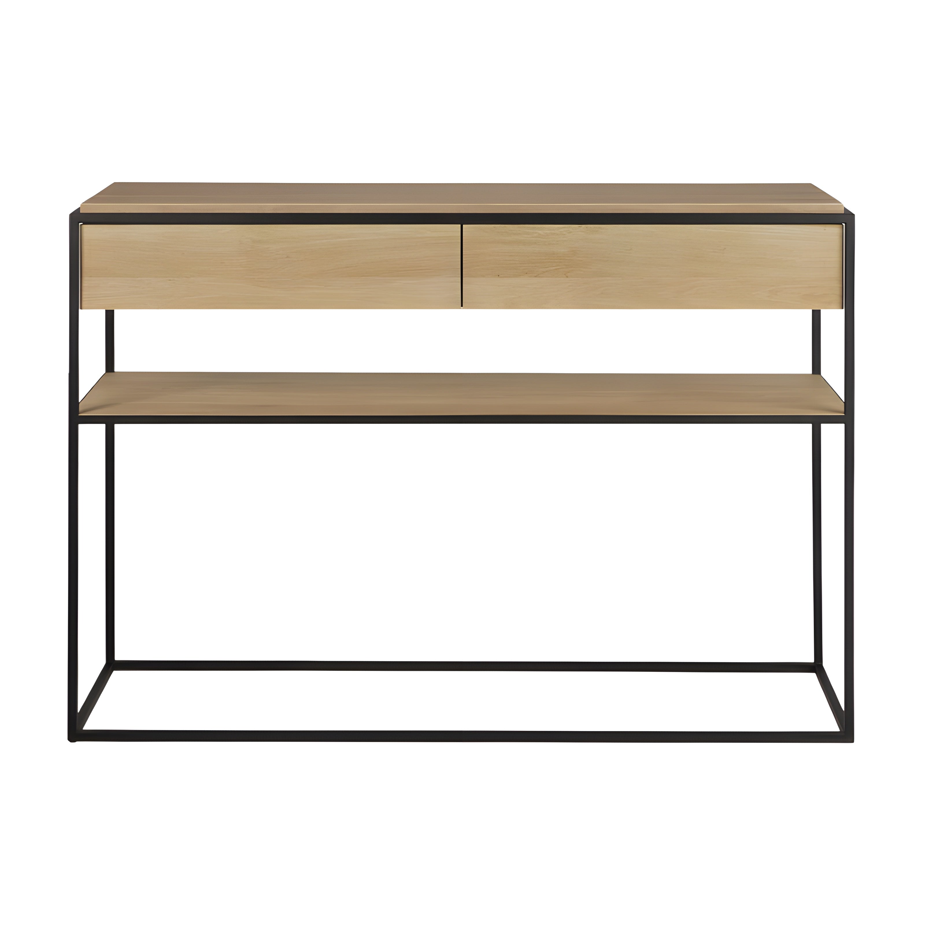 Experience the perfect balance of style and function with the Monolit Console by Ethnicraft. Crafted from solid light oak or black stained oak with a sleek black metal frame, this elegant piece features two spacious drawers and a shelf for convenient storage. Enhance your living space with this striking console that beautifully showcases your decor.