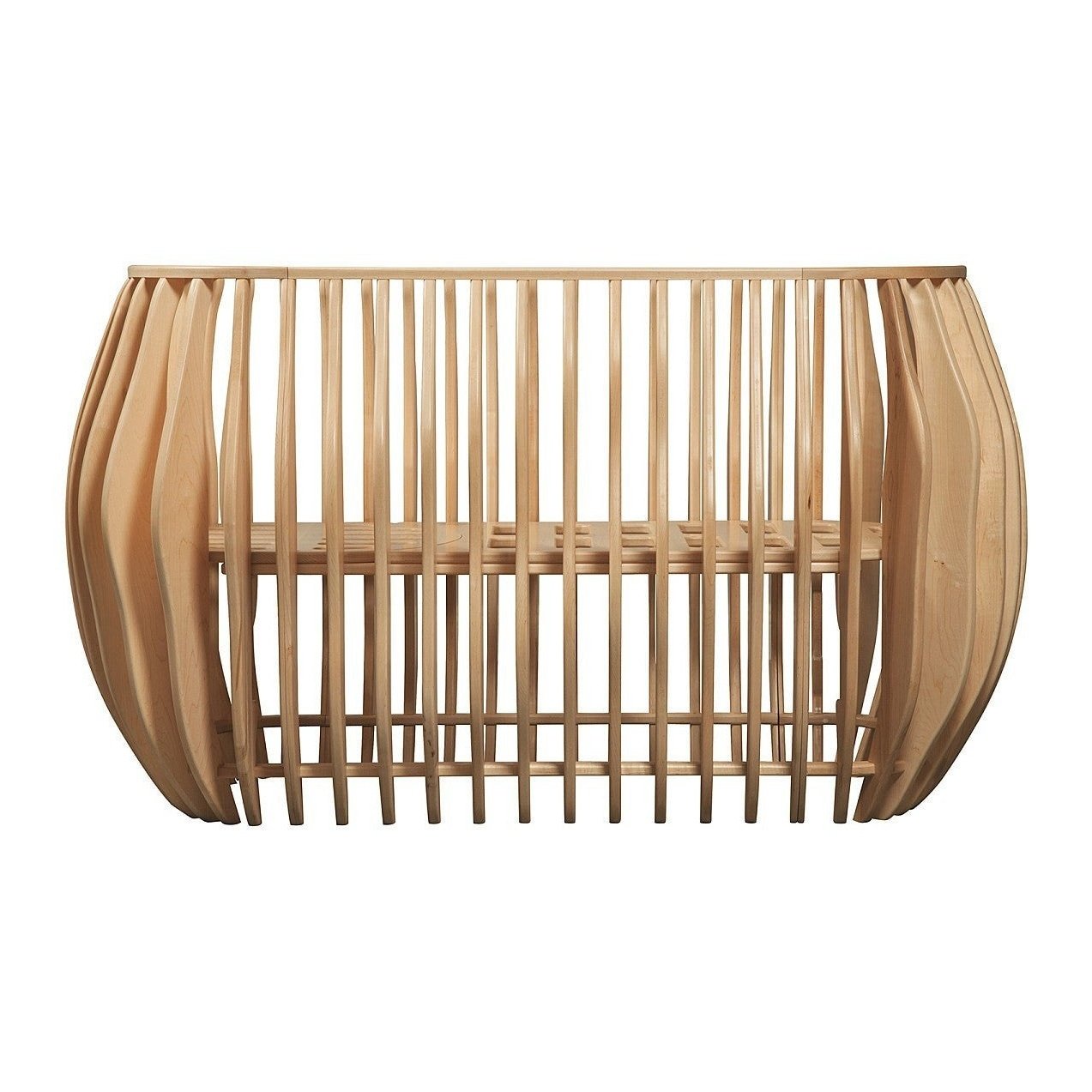 The Nursery Works Gradient Crib is made from solid maple hardwood, creating a stunning oval shape with a unique 3D skin that features asymmetrical slats, evoking a sense of continuous movement. This versatile crib easily converts to a bassinet, providing both style and functionality.