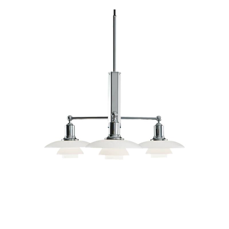 The PH 2/1 Stem Fitting Chandelier, designed by Poul Henningsen, is part of the innovative three-shade system he created between 1925 and 1926 in collaboration with Louis Poulsen. This partnership, lasting until Henningsen’s death in 1967, focused on achieving glare-free lighting and directing light where it was most needed.
