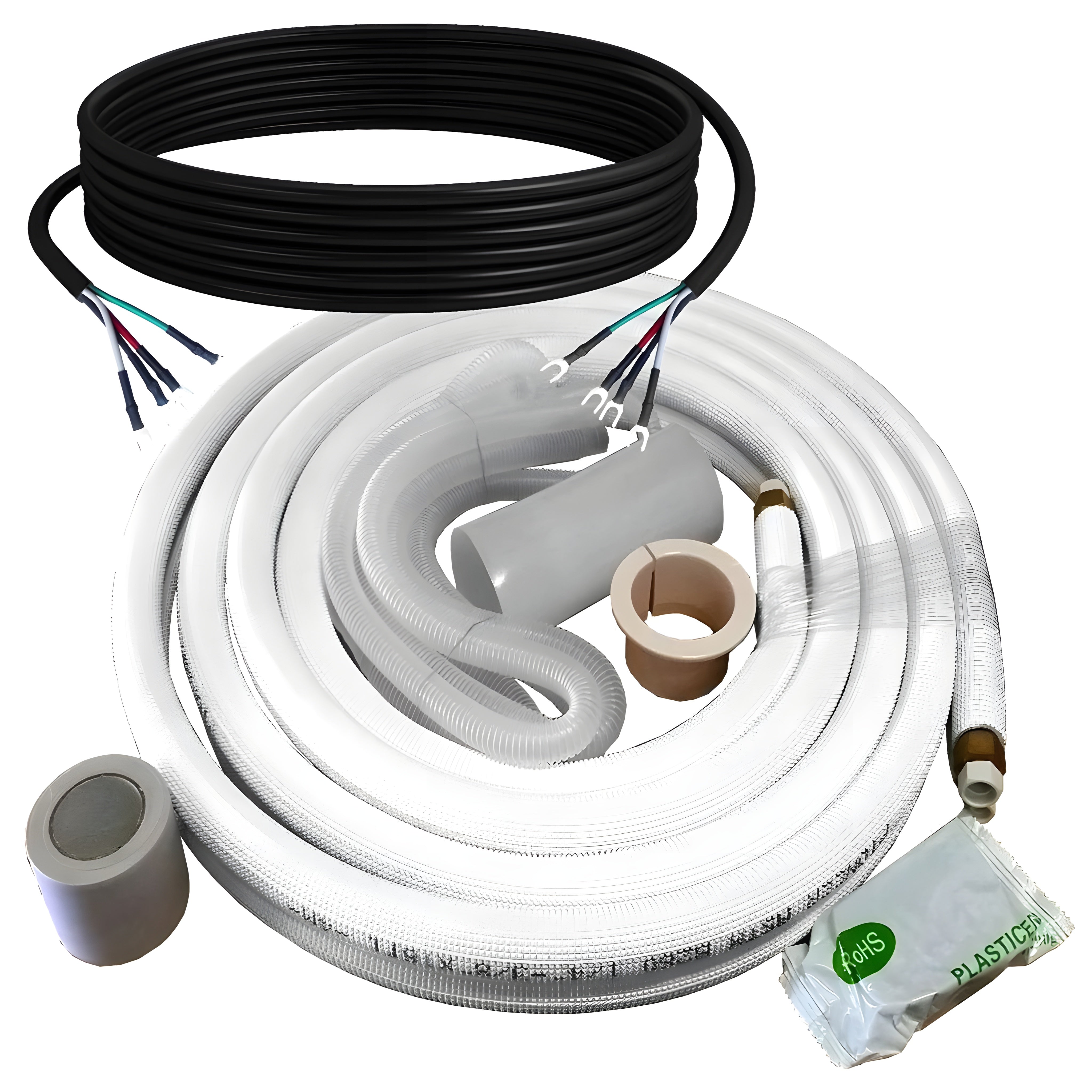 The copper tubing is included in the outdoor unit cardboard box and the communication wiring kit is included in the indoor unit cardboard box.
