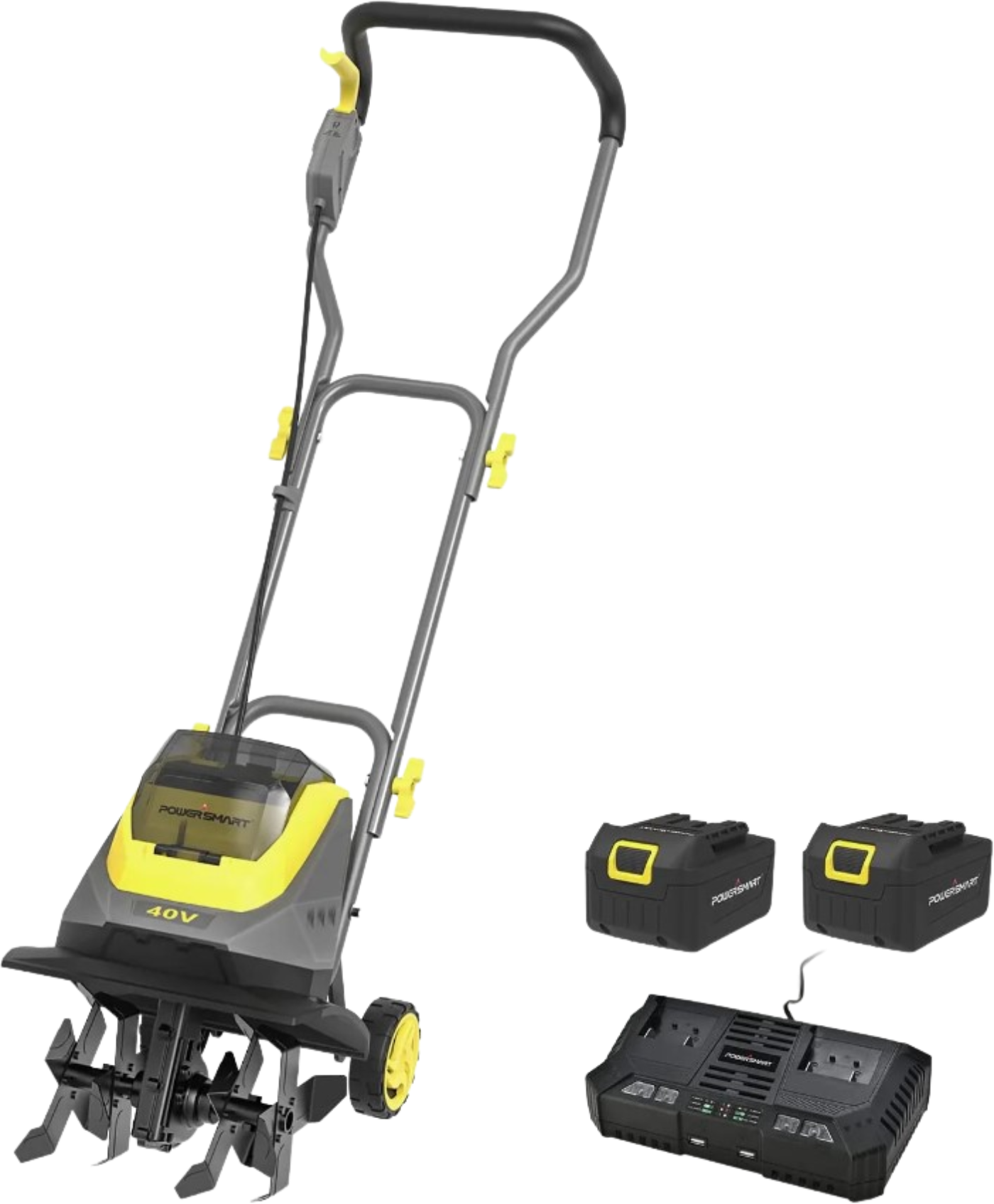A: The PS76221A comes with two 4.0Ah lithium-ion batteries, providing long-lasting power for extended tilling sessions without needing frequent recharges.