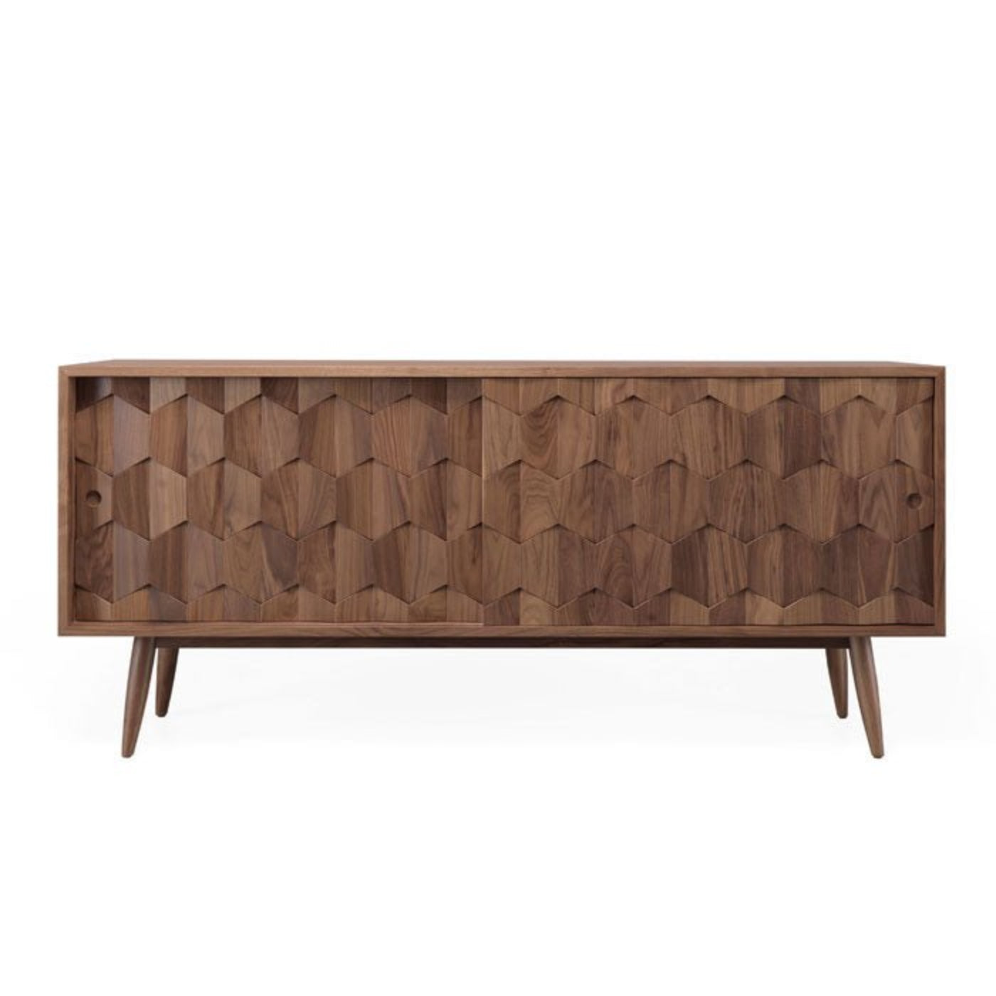 A: A refined, sculptural sideboard featuring intricate detailing and expert craftsmanship, designed as a standout storage piece in solid walnut.