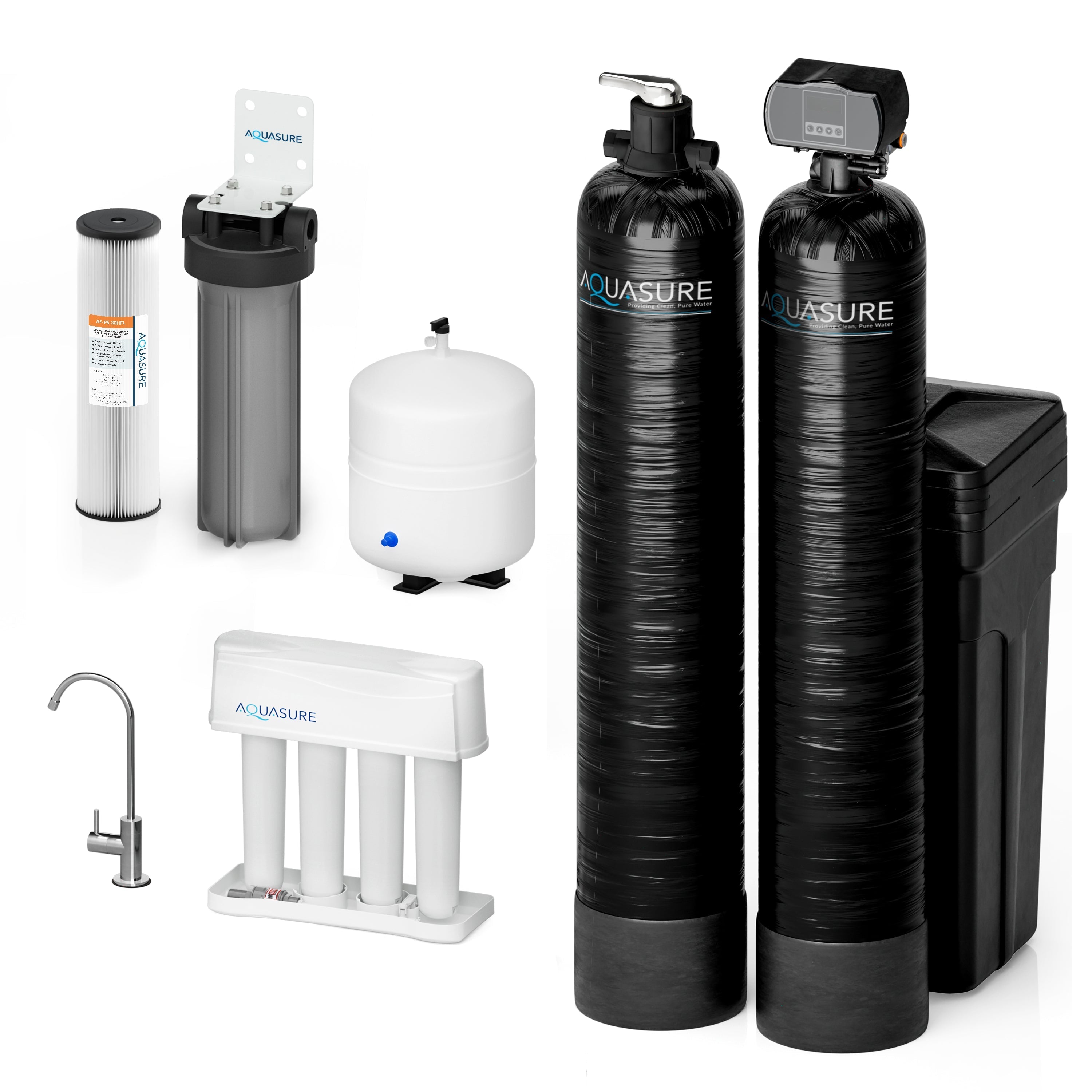 A: The bundle includes a 600,000-gallon whole-house water filtration system, a 32,000-grain water softener, and a 75 GPD reverse osmosis system.