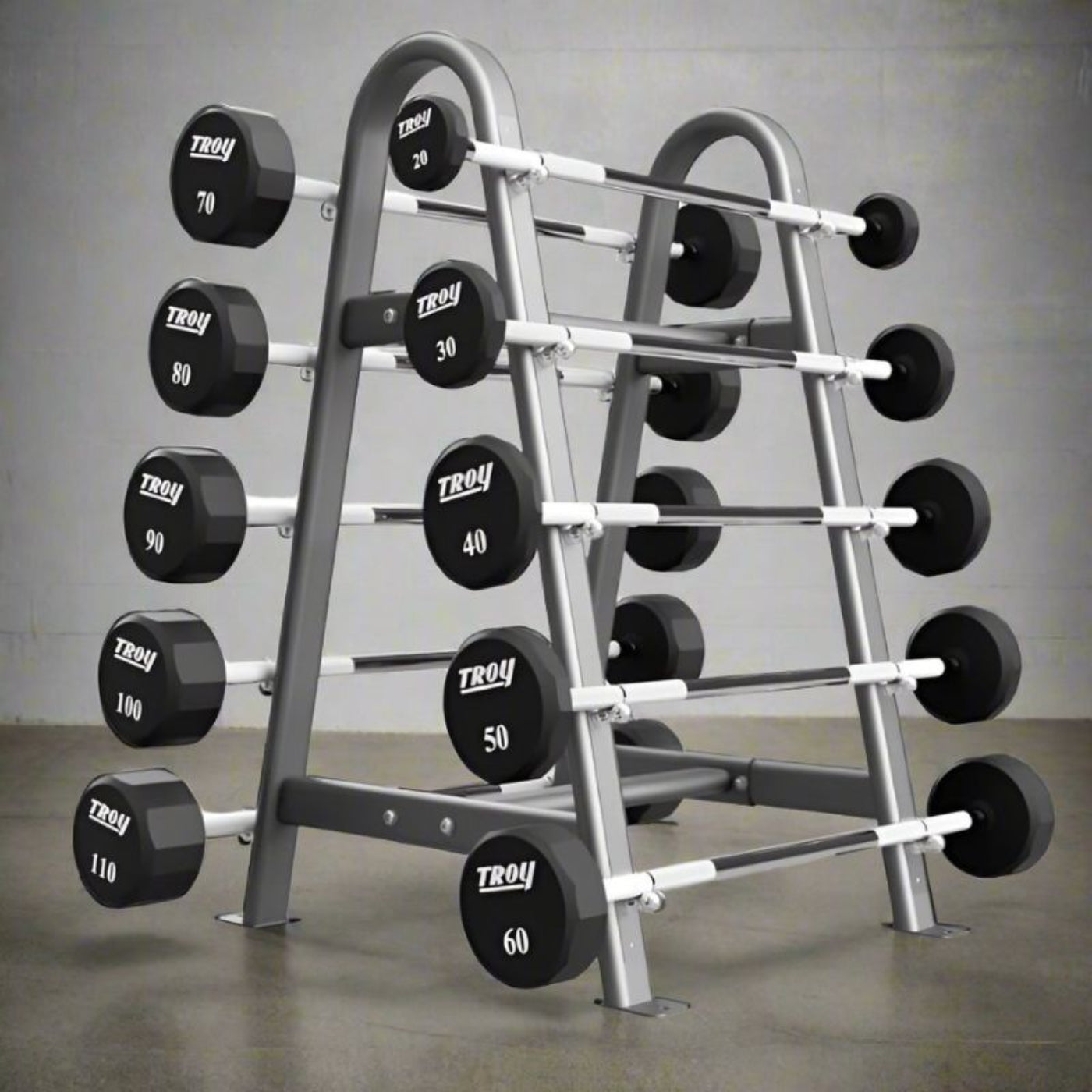 Looking for a Premium Straight Barbell Set? Get the Troy 12-Sided Urethane Straight Barbell Set with Rack!The Troy 12-Sided Urethane Straight Barbell Set with Rack is the ultimate solution for gyms, fitness centers, and home workout spaces. This high-quality barbell set with rack provides 10 fixed-weight straight barbell set options, ranging from 20 lbs to 110 lbs, all neatly stored in a space-efficient barbell rack storage unit. Each barbell is designed with solid steel heads, encased in high-grade urethane, and attached to a durable, hard-chrome steel bar—ideal for heavy lifting and long-term performance.Upgrade Your Training Setup!Take your gym to the next level with the Troy 12-Sided Urethane Straight Barbell Set with Rack. This complete barbell set with rack ensures smooth workouts with a space-saving barbell rack storage design. Whether you're looking for a durable barbell option or a professional straight barbell set, this is the ultimate choice. Order yours today and transform your workout space