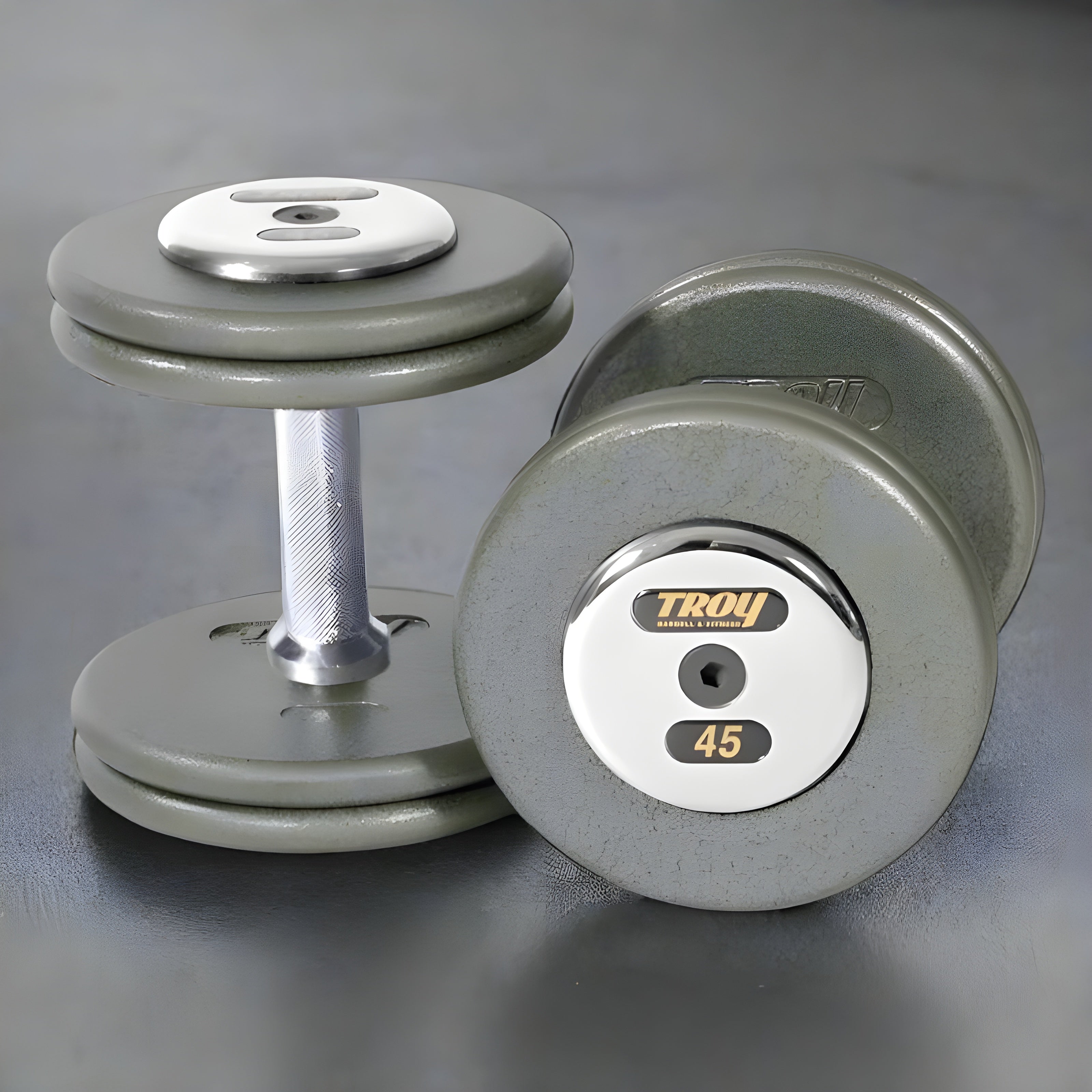 Searching for a Premium Dumbbell Set? Discover the Troy HFD-C Pro Style Dumbbells!The Troy HFD-C Pro Style Hammer-tone Gray Dumbbell Sets with Chrome End Caps are built for commercial-grade durability and exceptional performance. These Troy dumbbells feature robust steel alloy bolts, 27mm straight handles with deep-set knurling for superior grip, and premium gray hammer-tone plates. The chrome end caps, engraved with the TROY name and numbered tags, offer an elegant touch and easy identification. This dumbbell set is perfect for gyms and fitness enthusiasts looking for reliable, professional equipment.UPGRADE YOUR GYM TODAY! Invest in the Troy HFD-C Pro Style Dumbbells for a durable and stylish dumbbell set that meets commercial standards. These Troy dumbbells are perfect for gyms, studios, or home fitness spaces. Start building your strength with this premium dumbbell set today!