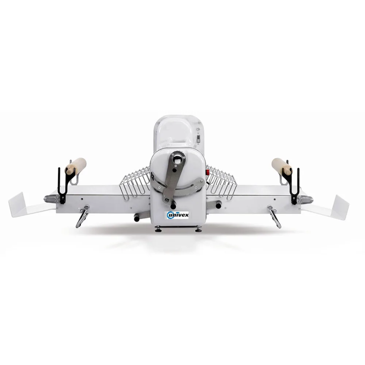 Not only safe, this bench-type dough sheeter is quite versatile and easy to use. It has, for example, an adjustable cylinder to change dough thickness. Its tables fold upright for storage and improved portability. The arms pivot and are removable for easy maintenance and storage. The unit operates with a simple-to-use start and stop design.