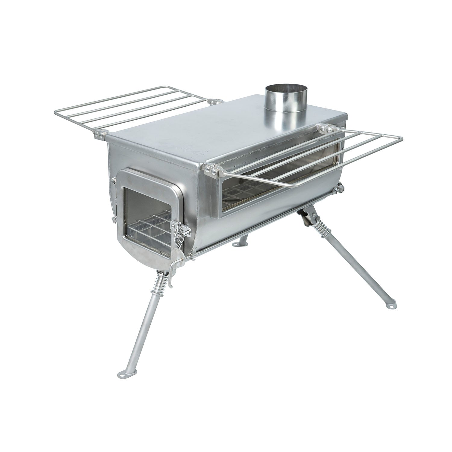 Featuring Winnerwell’s patented External Air design, the Woodlander Double View Plus External Air Stove sets a new standard for heating efficiency and safety in portable wood-burning stoves. Combined with the 3 large view windows, this stove delivers a truly deluxe hot tent experience.The external air design allows the stove to operate independently from the air inside the tent or shelter. This eliminates cold drafts and prevents the stove from consuming the hot air it has created, making it easier to heat a tent or shelter. Safety is also increased because the stove is not consuming the same air as the occupants inside the shelter—making this stove ideal for use in outdoor saunas and shelters with limited venting.