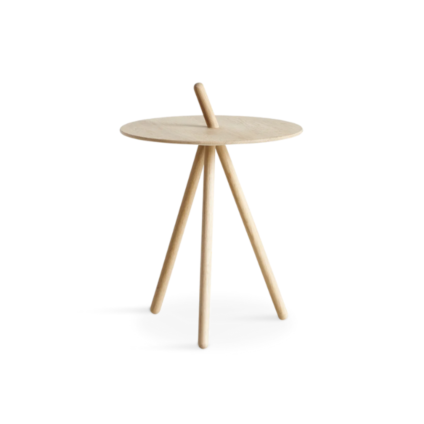 A: A minimalist, three-legged side table designed by Steffen Juul. One leg extends through the tabletop, doubling as a handle for easy movement.